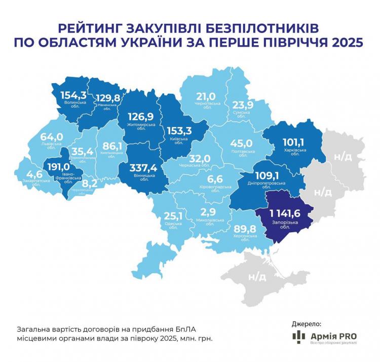 - Громади Вінницької області спрямували понад 337 мільйонів гривень на закупівлю БпЛА. Це дало змогу області посісти друге місце в Україні після прифронтового Запоріжжя.