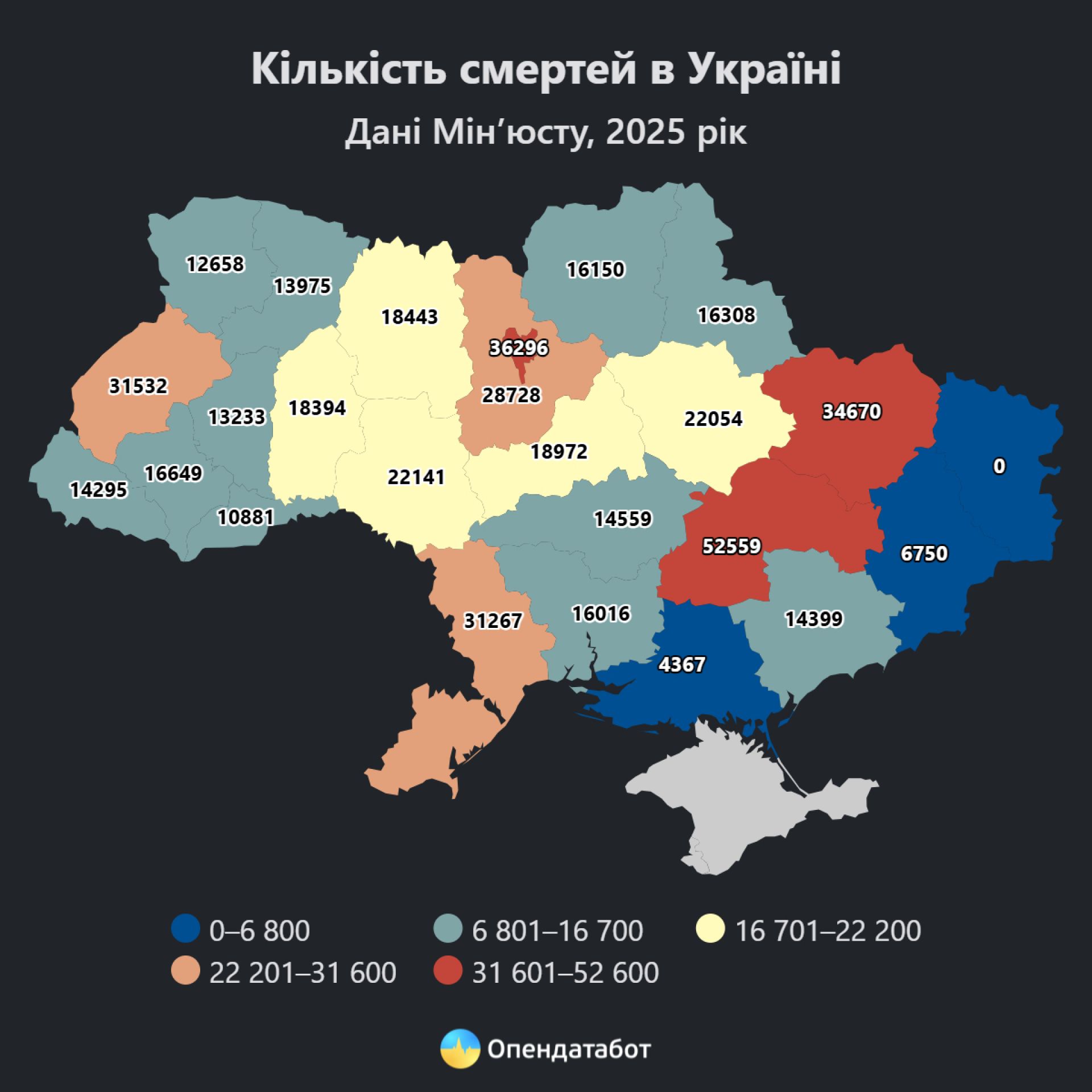 Загалом по Україні смертність скоротилася на 2%. Найбільше втрат зафіксували на Дніпропетровщині (понад 52 тисячі осіб). У Києві рівень смертності навпаки зріс на 2%. Вінниччина з показником 22 141 померлий тримається в межах середньостатистичних показників для тилових областей.