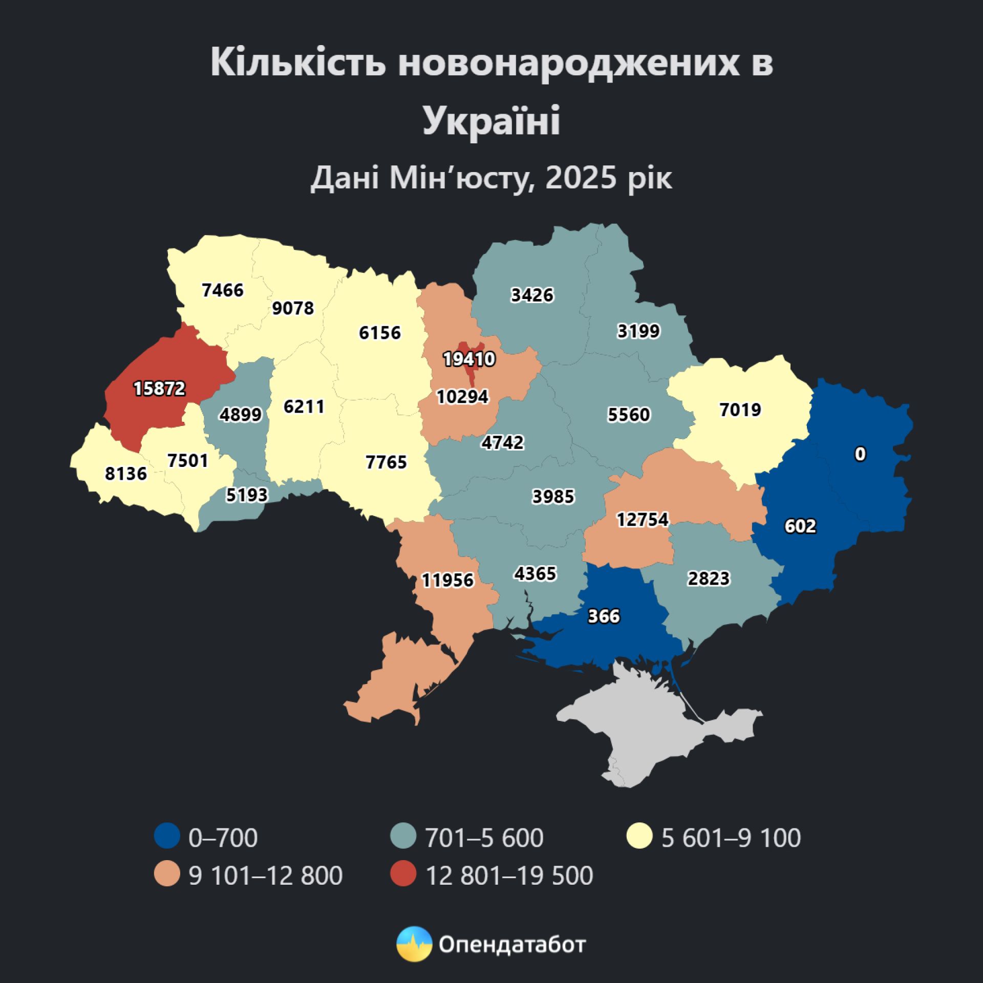 Цікаво, що деякі регіони навіть під час війни демонструють ріст. Львівщина додала 1,5% до кількості новонароджених, а Волинь — 0,6%.