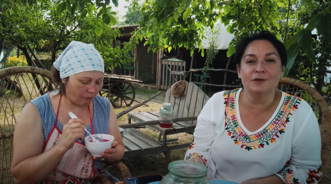 — Це був той випадок, коли я в повсякденній сільській роботі. І тут телефонує Павлова!!! «Оксана, ти вдома? Ми вже їдемо до тебе». Хіба можна відмовити Олені Павловій? Ні, — коментує зйомку Оксана Бас. — Але це реальність села. Ти не готувався, не чекав гостей. Але є город, є кури, є яйці і завжди є борщ!!! І є проста сільська гостинність.