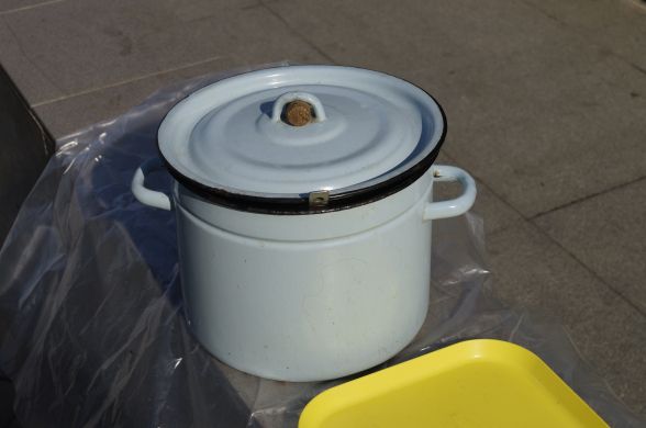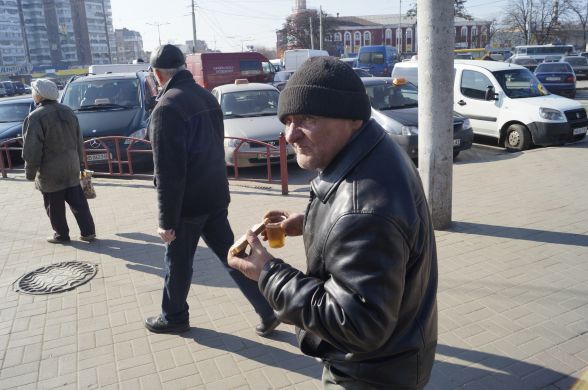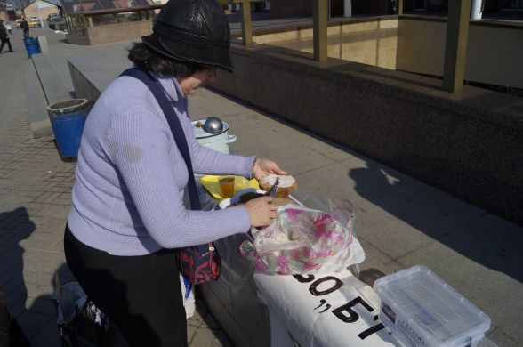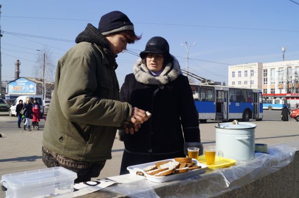 Не знайшовши стіл і у закладах по сусідству, волонтери вирішили проводити акцію розклавши харч на гранітну стінку входу до підземного переходу. З собою принесли кілька пакетів. У них велика каструля з чаєм, буханка порізаного хліба, кілограм вівсяного печива і кульок перемеленого зі спеціями сала. Розстеливши целофанову скатертин жінка починає наливати чай в одноразові стаканчики та мастити бутерброди салом. Ставить скриньку для пожертв.