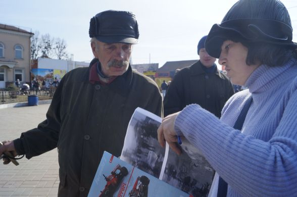 Майже одразу до нас підходять кілька людей. Одні просять бутерброди, інші розпитують, що тут відбувається. Дві працівниці залізничного вокзалу намагаються з’ясувати чи є у волонтерів дозвіл.