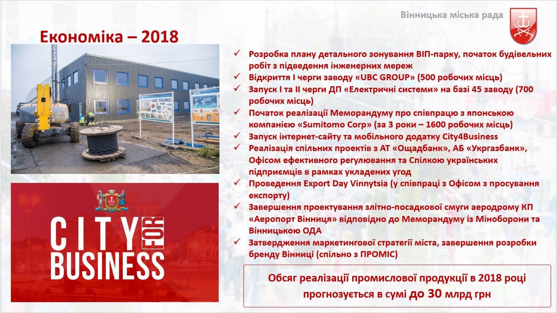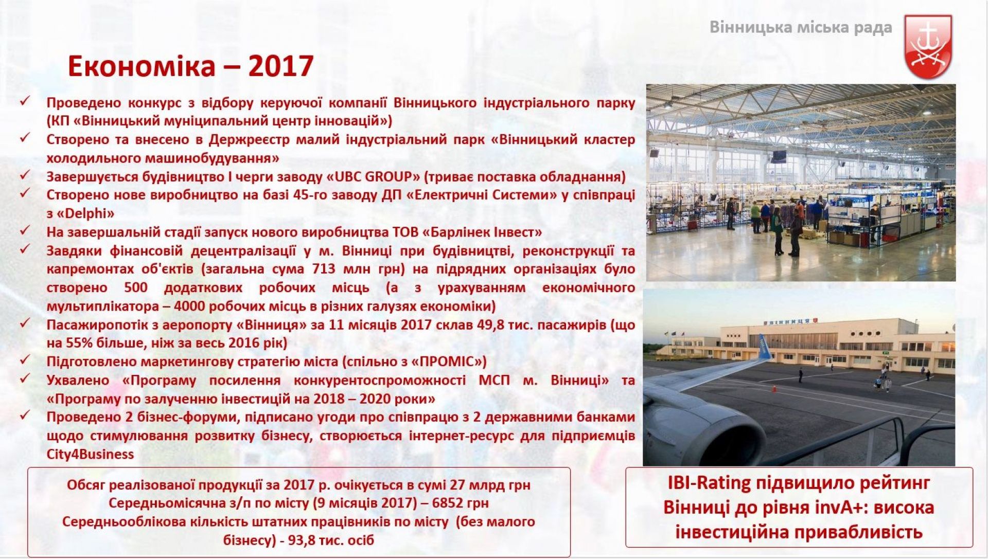 Агентство IBI-Rating 2017-го підвищило рейтинг Вінниці до рівня invА+ (висока інвестиційна привабливість), що є гарним сигналом для вітчизняних та закордонних інвесторів.