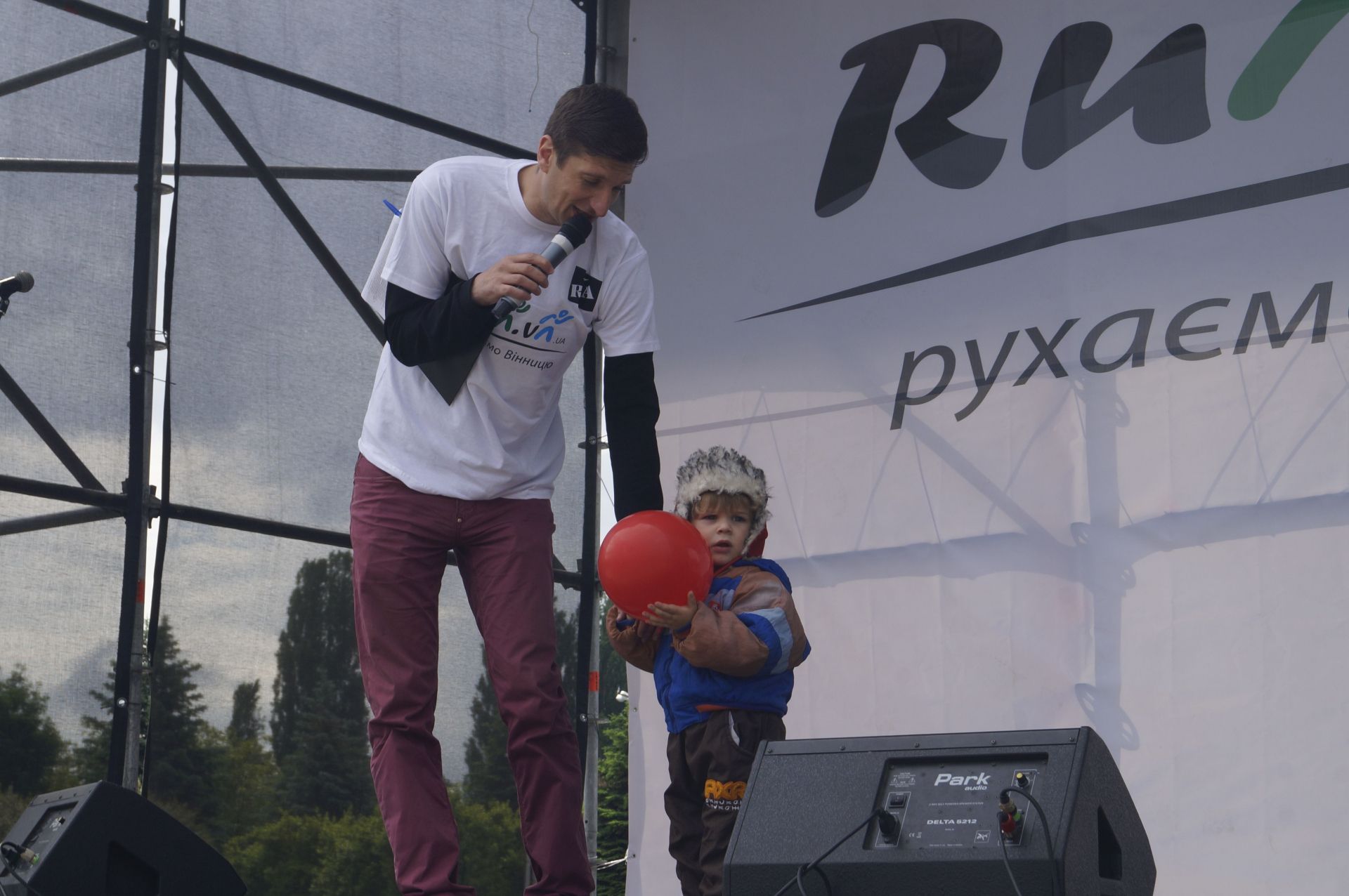 А на сцену вже запросили наймолодшого учасника «Вінниця біжить» хлопчику ще не виповнилось і двох років, а також найстаршого учасника. Їм мали вручити подарунки.