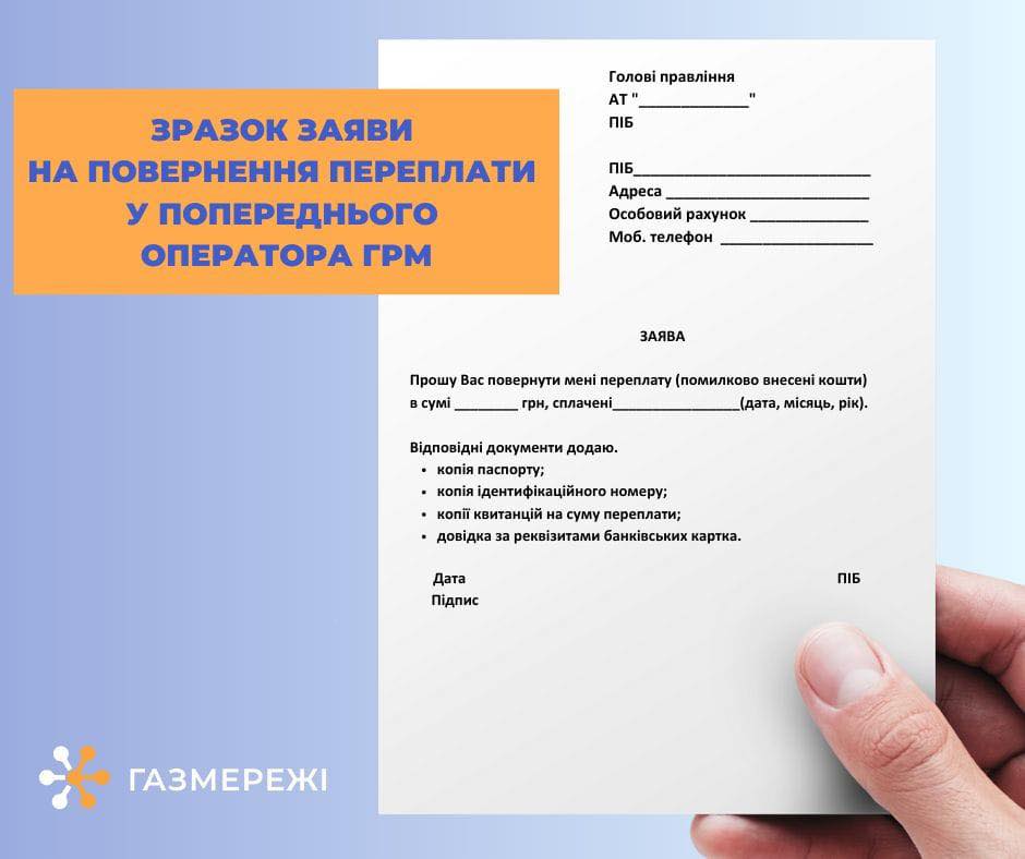 - письмова заява про повернення коштів, адресована АТ «Вінницягаз»;