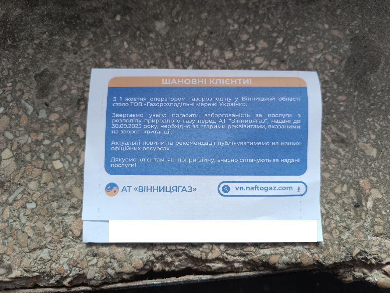Попередній облгаз став розсилати платіжки з «остаточним рахунком за послуги розподілу газу». У цих квитанціях «Вінницягаз» просить сплатити борги перед ними за послуги, що були надані до 30 вересня 2023 року включно. І цей борг потрібно платити за старими реквізитами, на рахунок АТ «Вінницягаз».