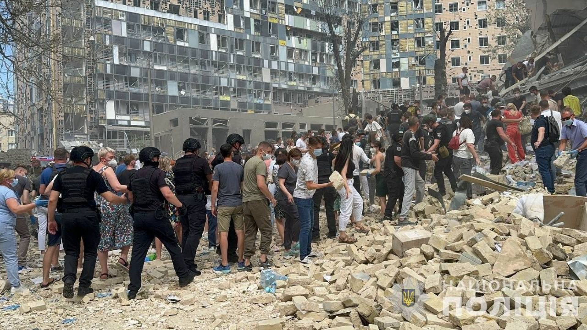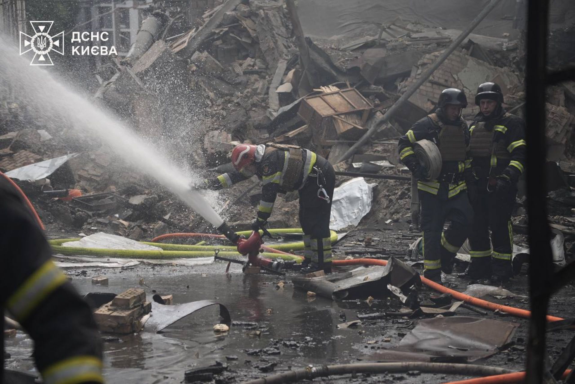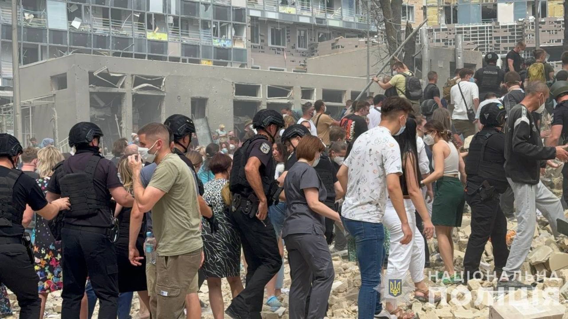 У Соломянському районі внаслідок падіння уламків ракети сталося пошкодження 2 поверхів бізнес-центру. Руйнування на площі 1500 м. кв. Один загиблий, 2 травмованих.