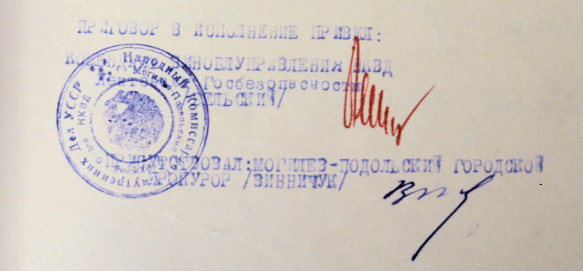 Я, комендант Віноблуправління НКВС УРСР лейтенант Держбезпеки Бєльський на підставі рішення народного комісара Внутрішніх справ СРСР — генерального комісара тов. Вишинського (протокол №90 від 11.01.1938 року) і припису начальника управління НКВС УРСР по Вінницькій області — майора Держбезпеки тов. Морозова від 17.01.1938 року — у присутності Могилів-Подільського прокурора Віннічука о 24 годині 00 хвилин виконав вирок вищої міри покарання — розстріляв засуджених. Список додається».