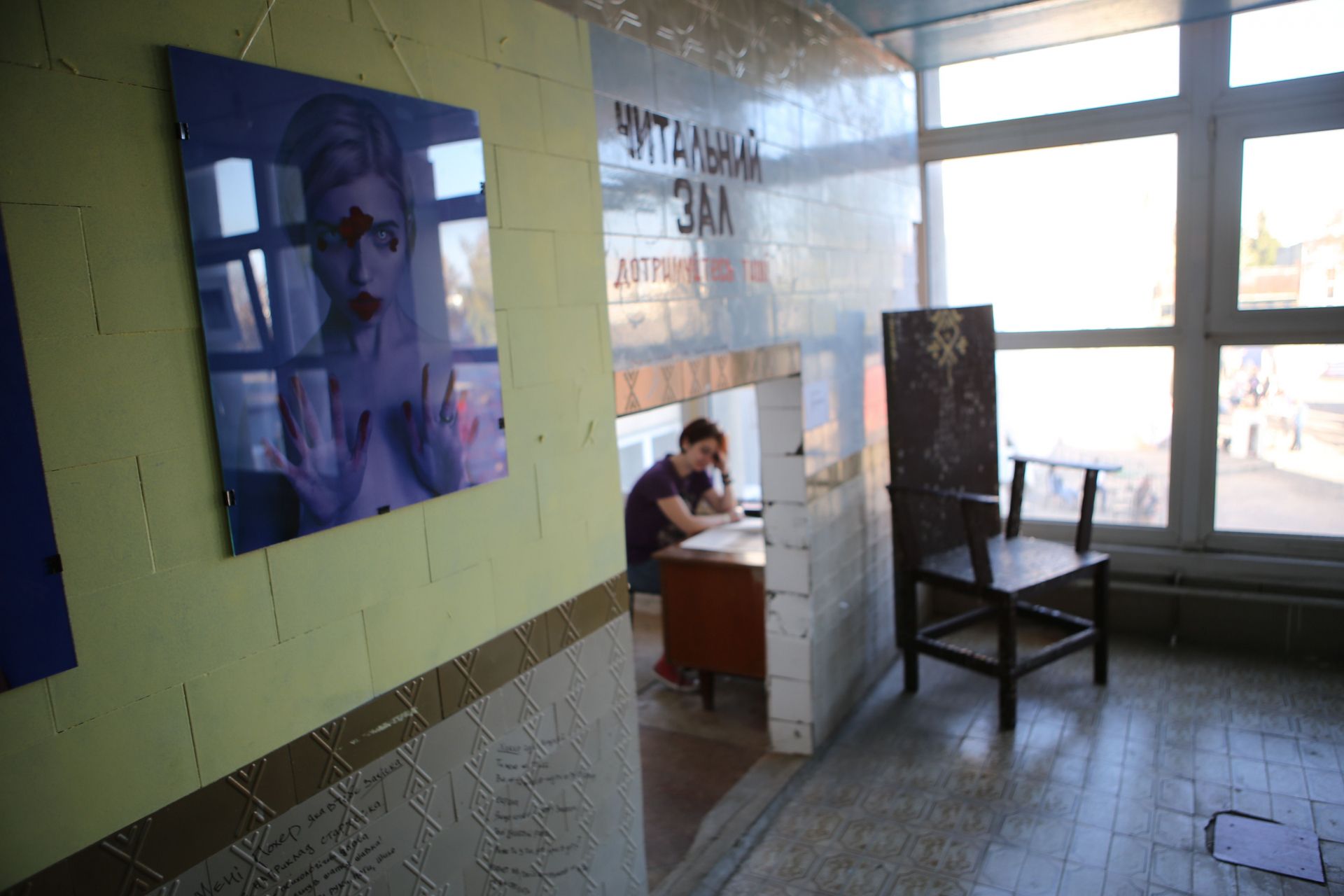 Піднімаючись вище примітили виставкову залу, де на стінах фотопортрети та найкрутіша читальна зала: вона зовсім крихітна, 2 на 2 метри, у ній тільки на стіл, стілець та плакати на стінах. На столі видрукований журнал з чорно-білими фото та філософськими цитатами.