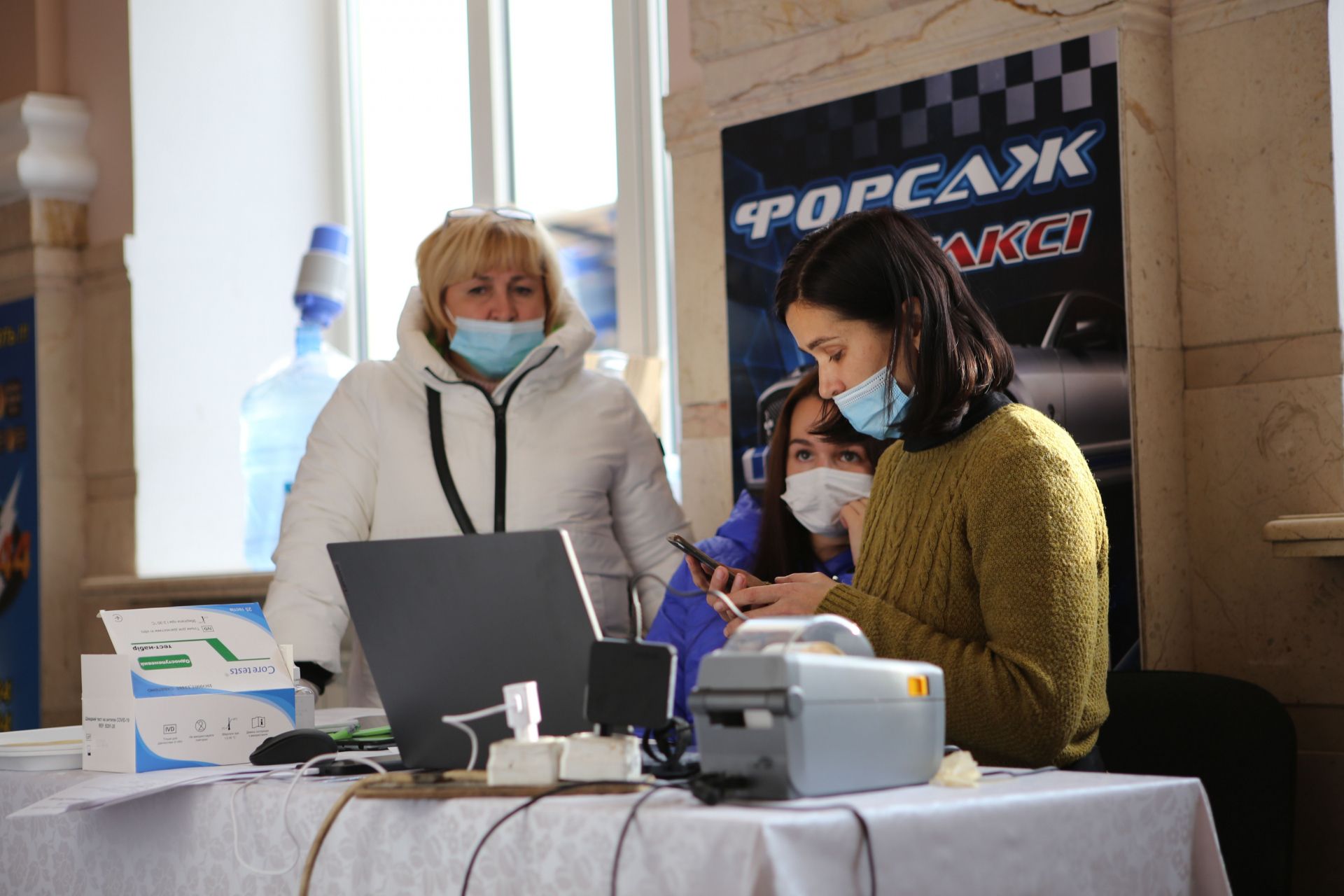Коли потяг поїхав у Хмельницький, і на пероні залишилися лише провожаючі, ми йдемо дивитися, як роблять експрес-тести. Біля вікон у касовому залі бачимо білу ширму. Поруч з нею двоє людей очікують на свою чергу.