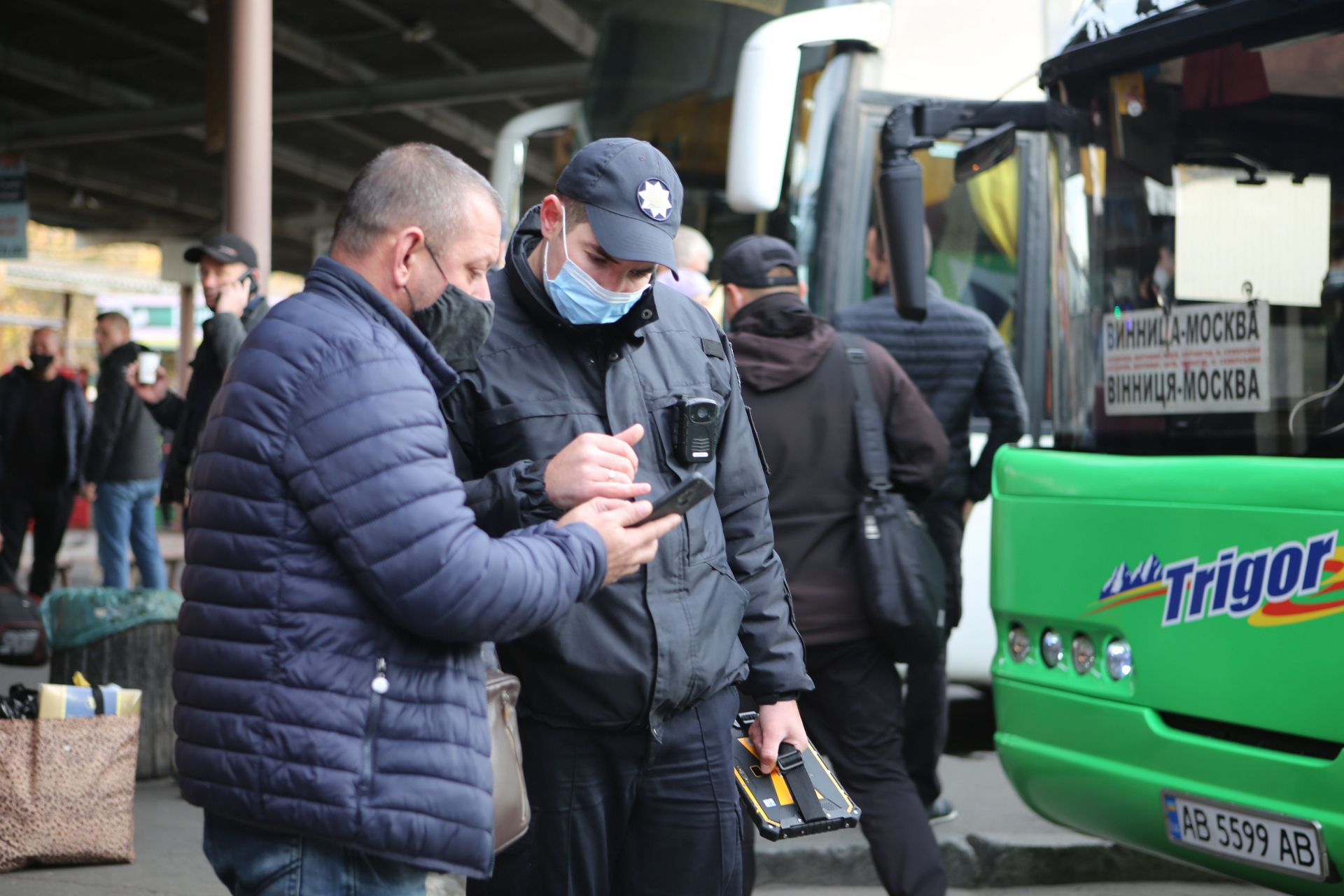 Четвер, 08.30 ранку. На вінницькому автовокзалі людно. Помічаємо кілька поліцейських, вони підходять від автобуса до автобуса і перевіряють документи. Бачимо, що не всі водії й пасажири надто вдоволені новими правилами поїздок.