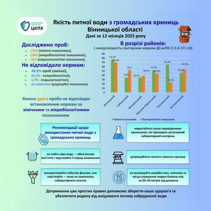 За останній рік лабораторні дослідження показали тривожні результати: у Вінницькій області майже половина проб води з громадських криниць не відповідає санітарним нормам. Про це повідомляють у Вінницькому обласному центрі контролю та профілактики хвороб МОЗ України.