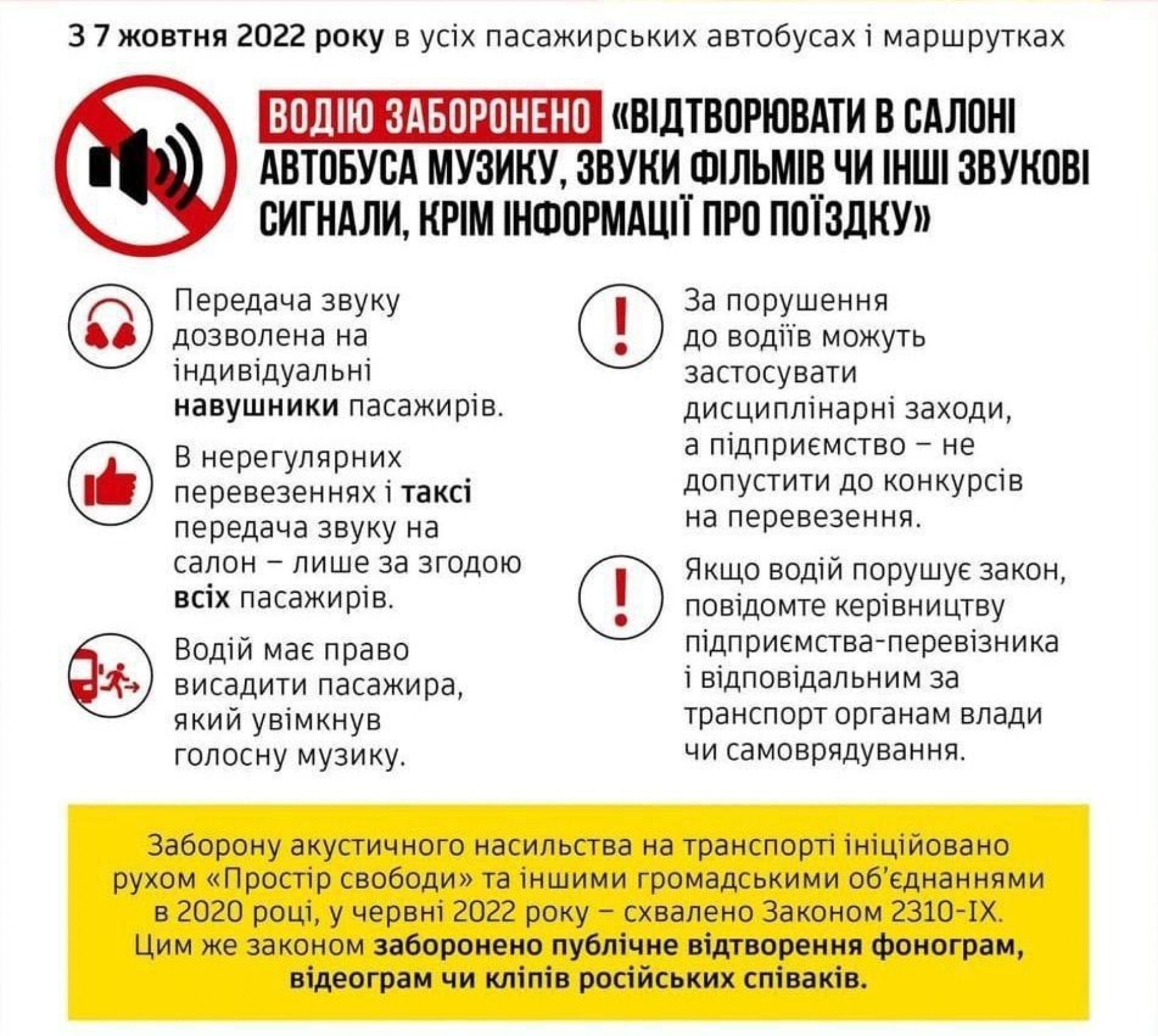 - Водіям автобусів не можна вмикати у салонах музику чи інші звукові сигнали. Заборона починає діяти від сьогодні, 7 жовтня.