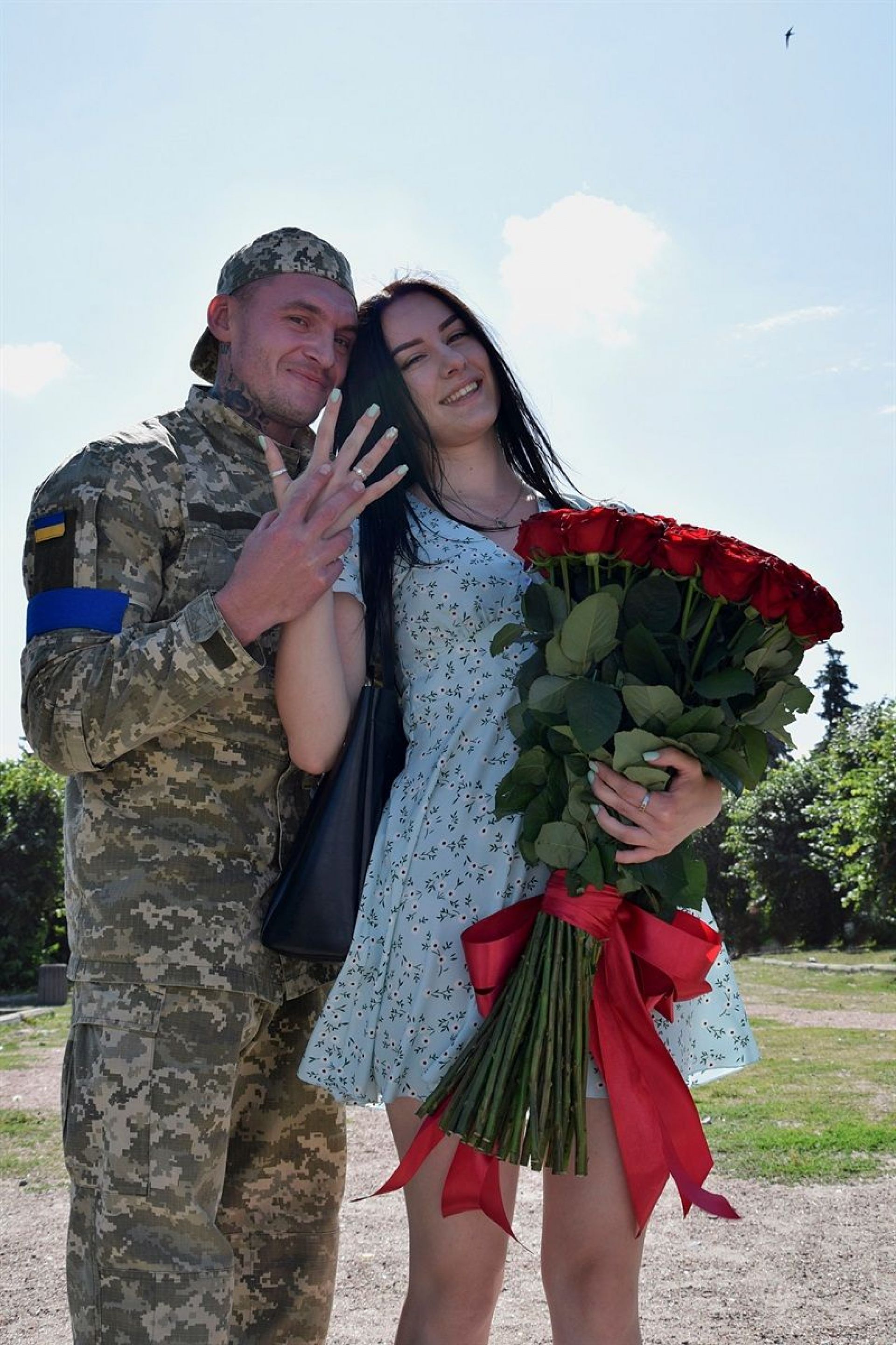 Ззаду підійшов її коханий Олексій, який нині перебуває на службі у ЗСУ. Чоловік встав на коліно, покликав її та освідчився. Дар'ї він подарував великий букет троянд. Дівчина відповіла «Так» та прийняла обручку.