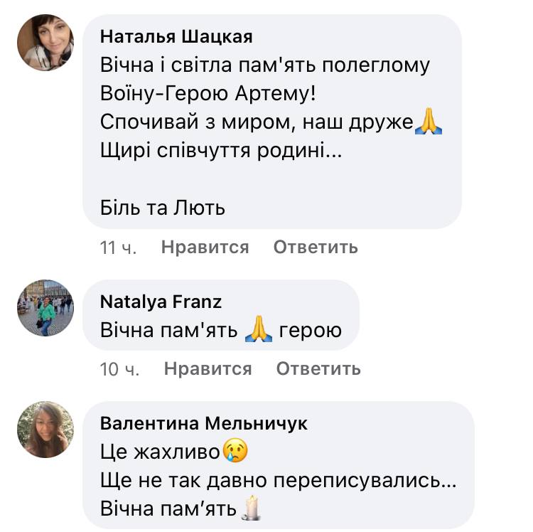 Волонтерка Олена Стеценко ділиться спогадами про Артема: «Біль... Артем Іванішин, ти такий розумаха… і я не можу писати про тебе «був»… Хто мені писатиме вночі, що треба йти в укриття, бо я вам ще турнікети маю передавати. Як же важко в це повірити. Клята війна забирає найкращих...Вибач, що через постійні жарти не сказала тобі цього раніше, ти — найкращий! Мʼяких тобі хмаринок...».