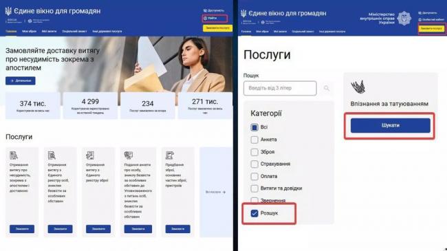 На порталі «Єдине вікно для громадян» запрацював новий сервіс «Впізнання за татуюванням», який дозволяє встановлювати особи людей, зниклих безвісти за особливих обставин. Про це повідомили у пресслужбі Міністерства внутрішніх справ України.