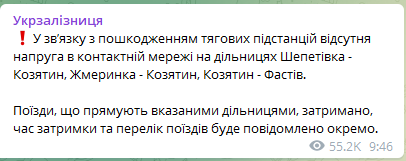 У зв’язку з пошкодженням тягових підстанцій, відсутня напруга у контактній мережі на ділянках Шепетівка-Козятин, Жмеринка-Козятин, Козятин-Фастів. Про це пишуть на офіційному каналі Укрзалізниці, на якому публікують інформацію щодо роботи компанії у надзвичайному режимі.