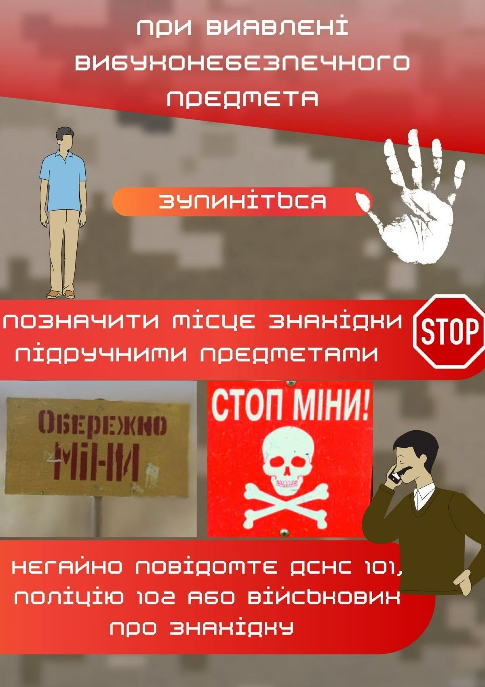- Вибухонебезпечні предмети можуть вибухнути від найменшого фізичного впливу на них. Побачили вибухонебезпечний предмет? Відійдіть якнайдалі та повідомте про знахідку, зателефонувавши 101.