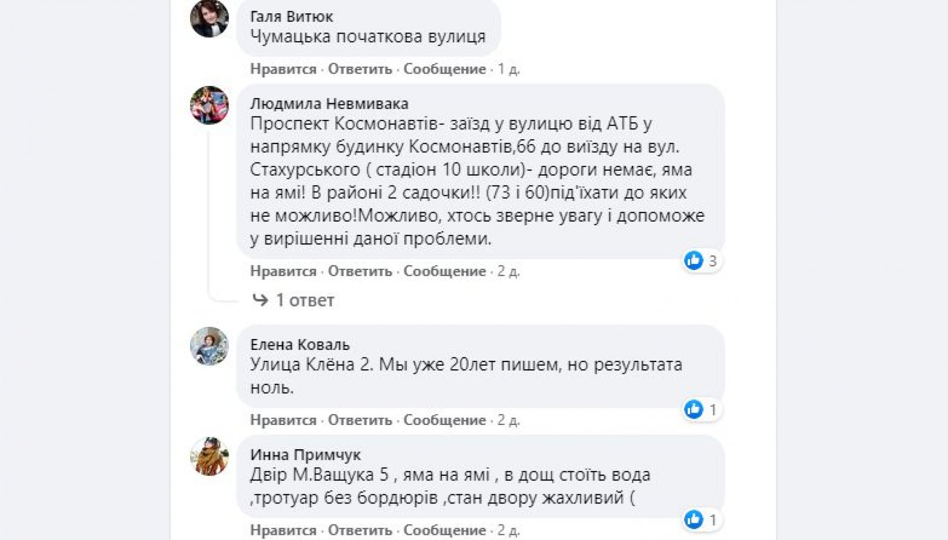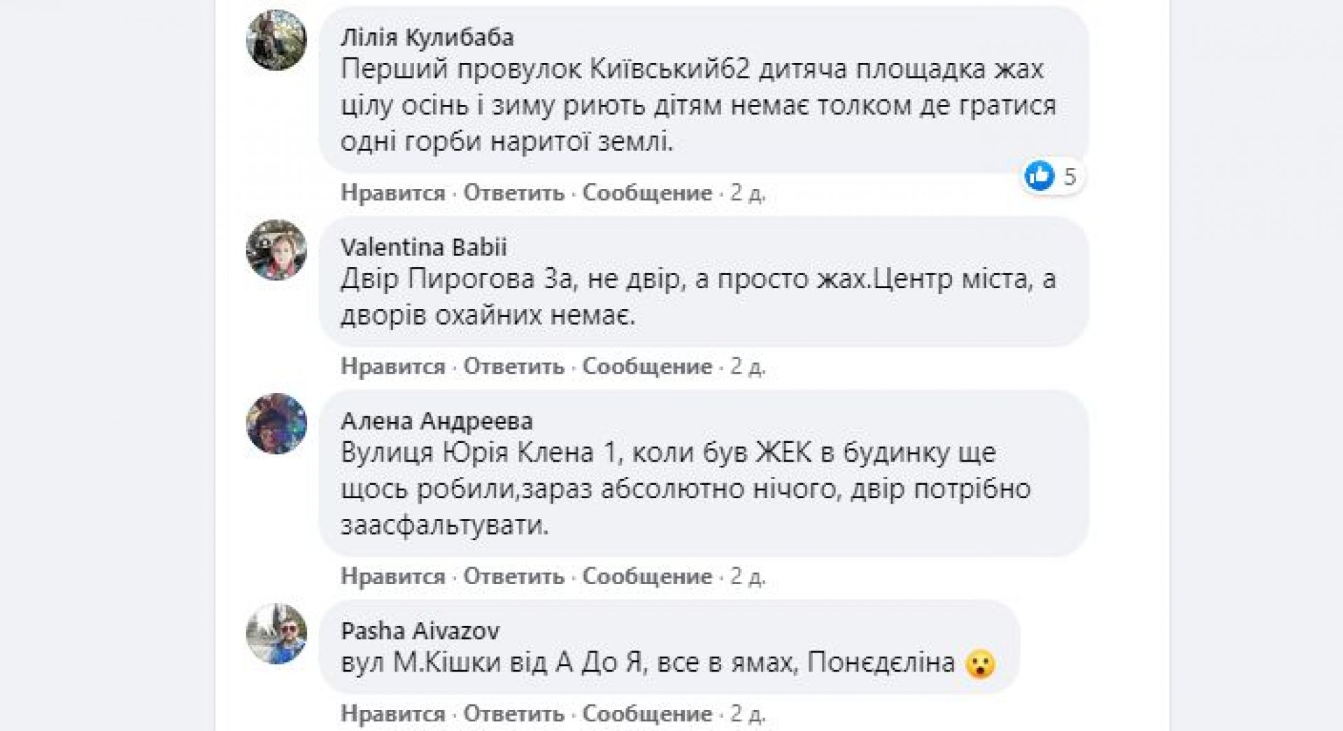 До цієї новини спитали вінничан: «Чи є потреба у вашому дворі навести лад з дорогою чи тротуарами?». У відповідь отримали майже два десятки коментарів з адресами, де потрібно зробити ремонт. Ось деякі з них: