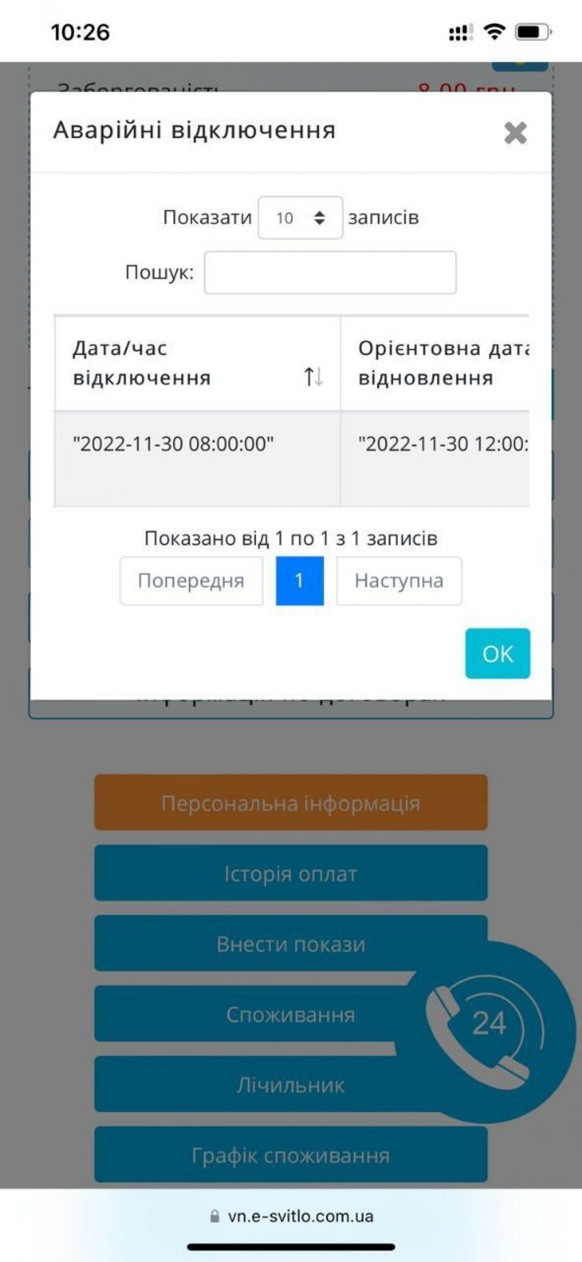 Переглянути планові та аварійні відключення можна в особистому кабінеті на сайті АТ «Вінницяобленерго» https://vn.e-svitlo.com.ua/ та Viber боті https://vb.voe.com.ua/