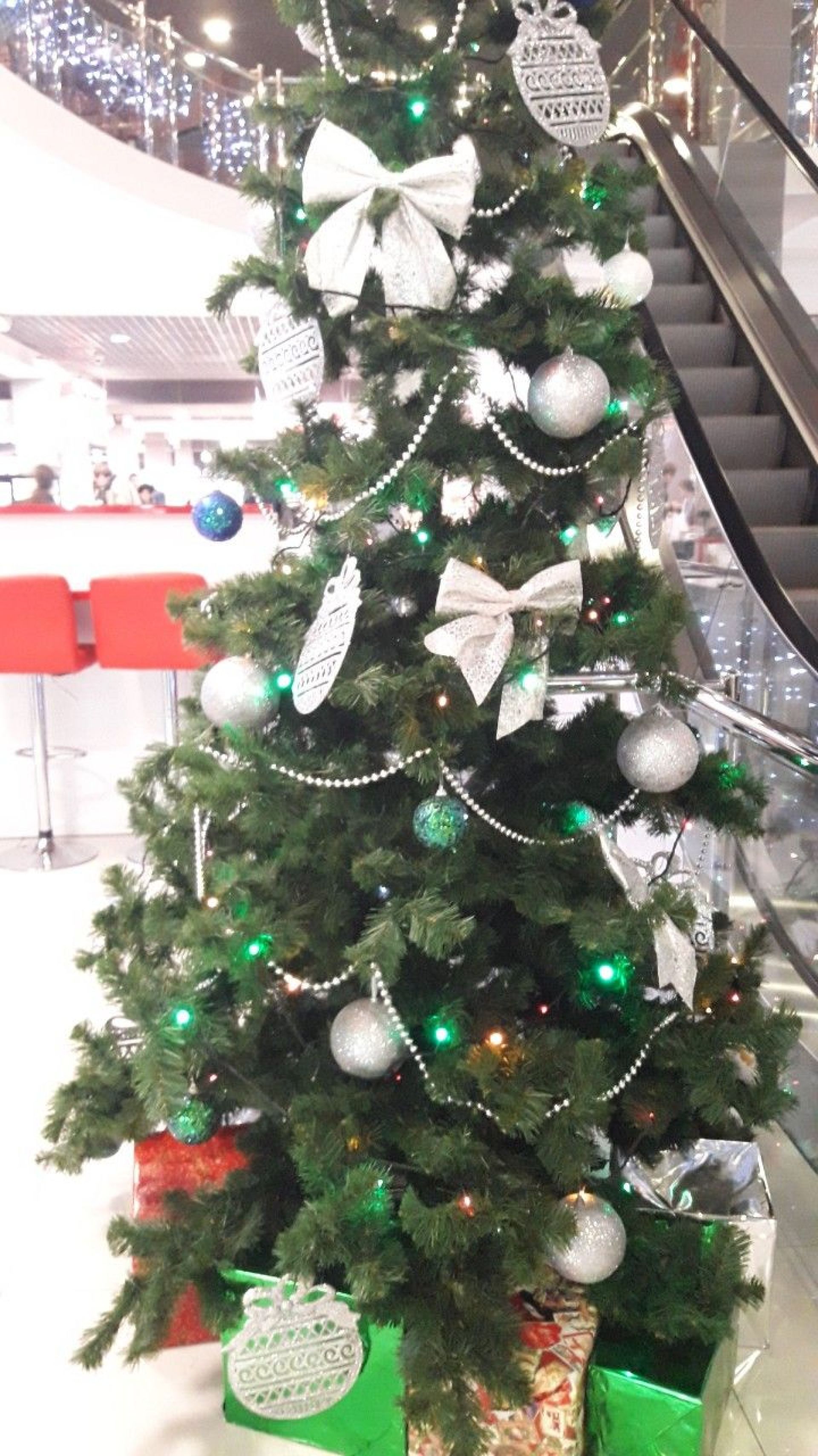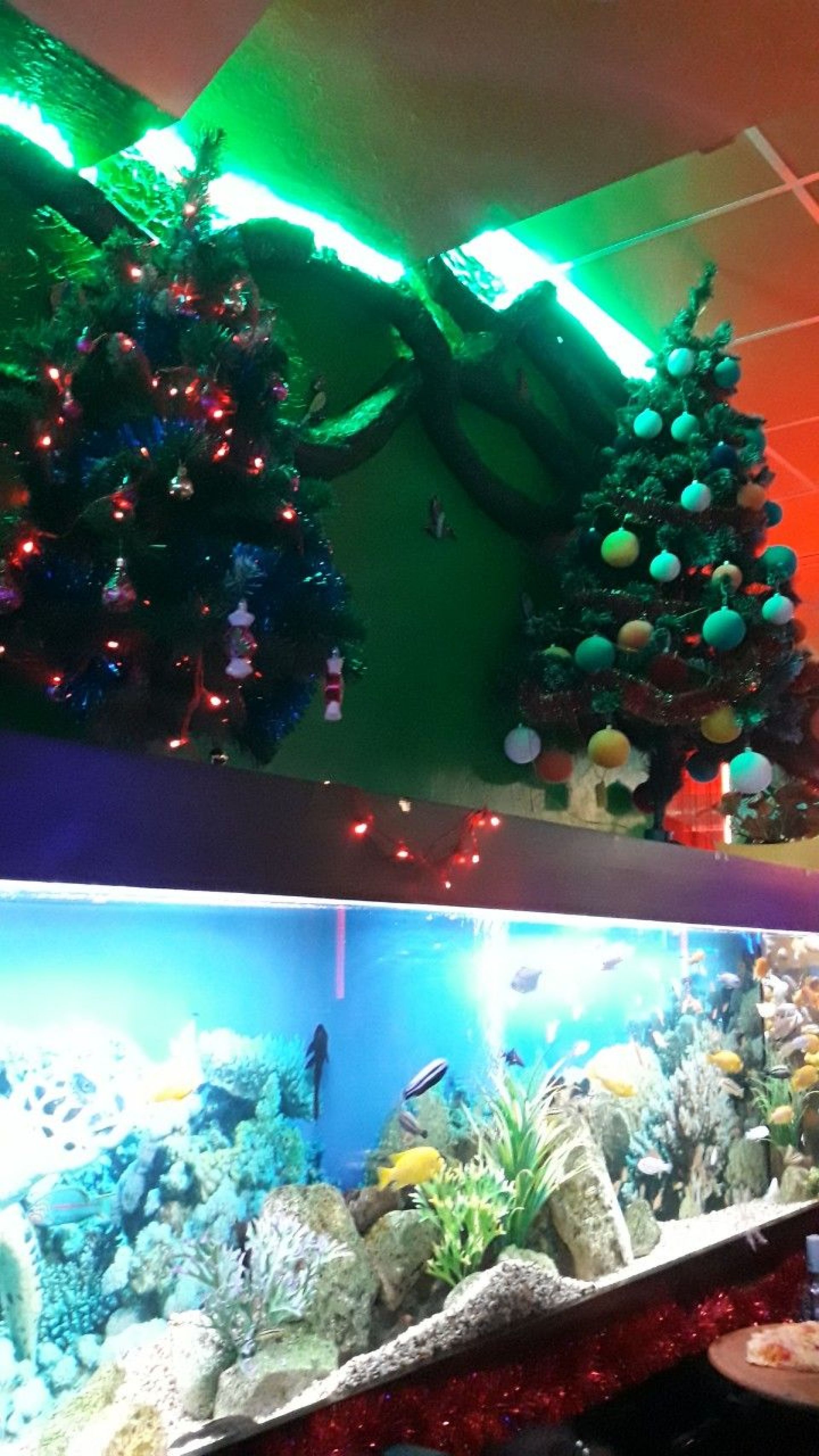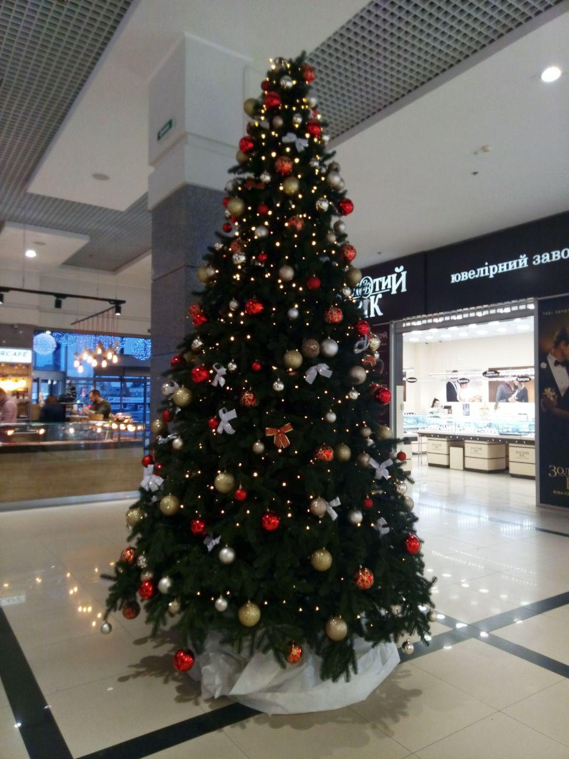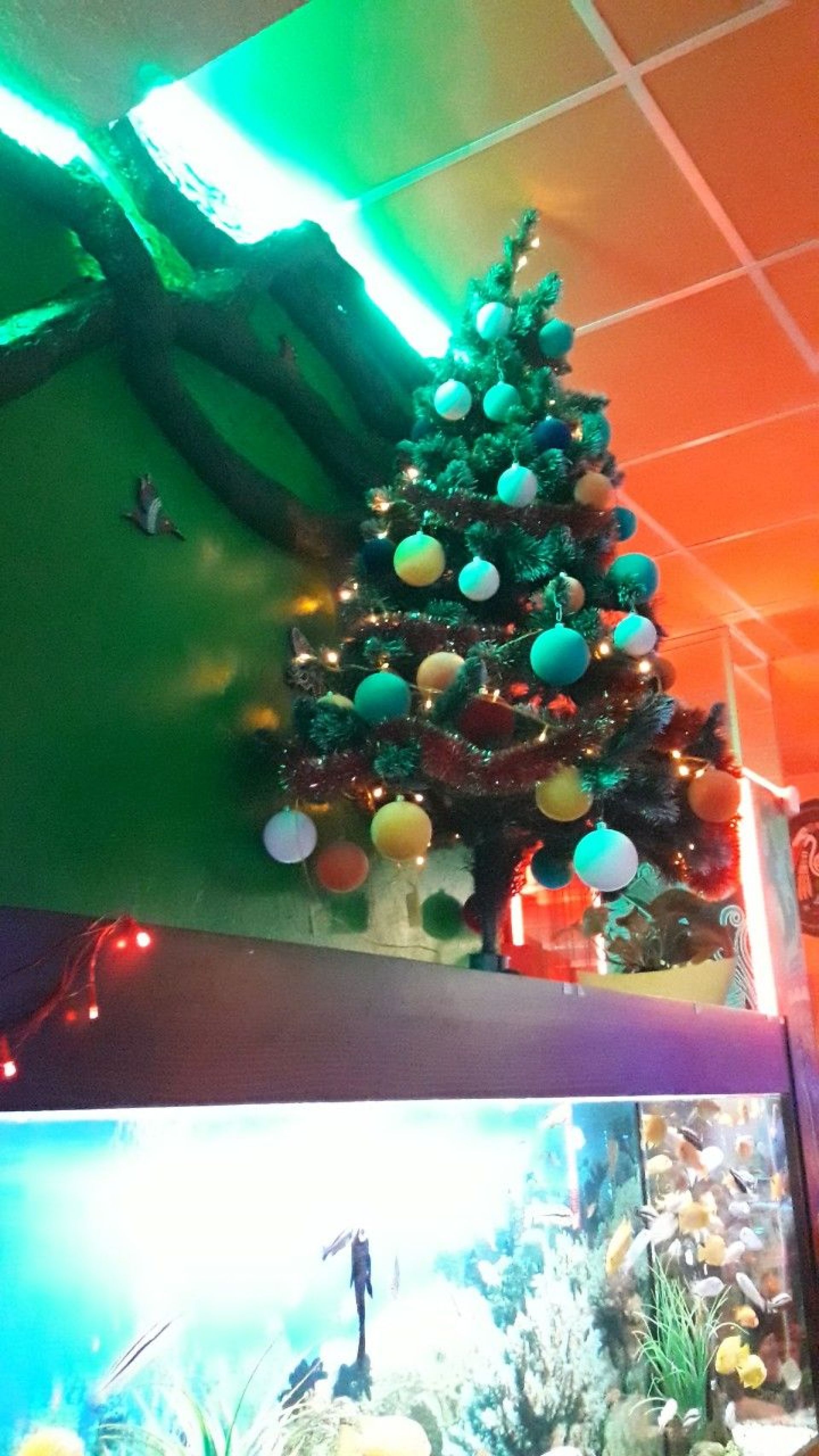 У одному з закладів харчування прикрашені ялинки стоять прямо на величезному акваріумі. Але здебільшого у громадських місцях стоять штучні, пухнасті сосни, прикрашені у двох-трьох тонах, з блискітками, дощиком та бантиками.