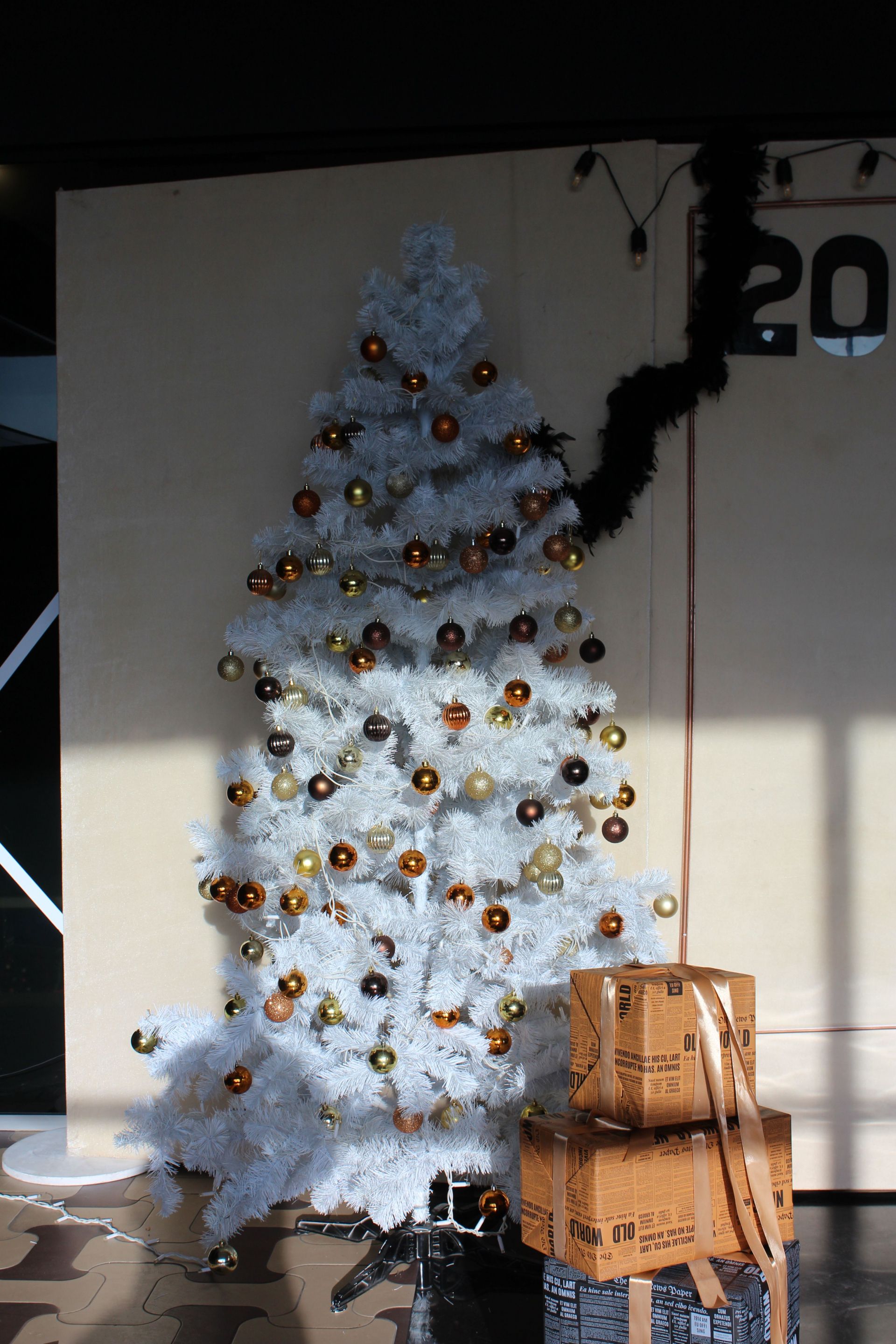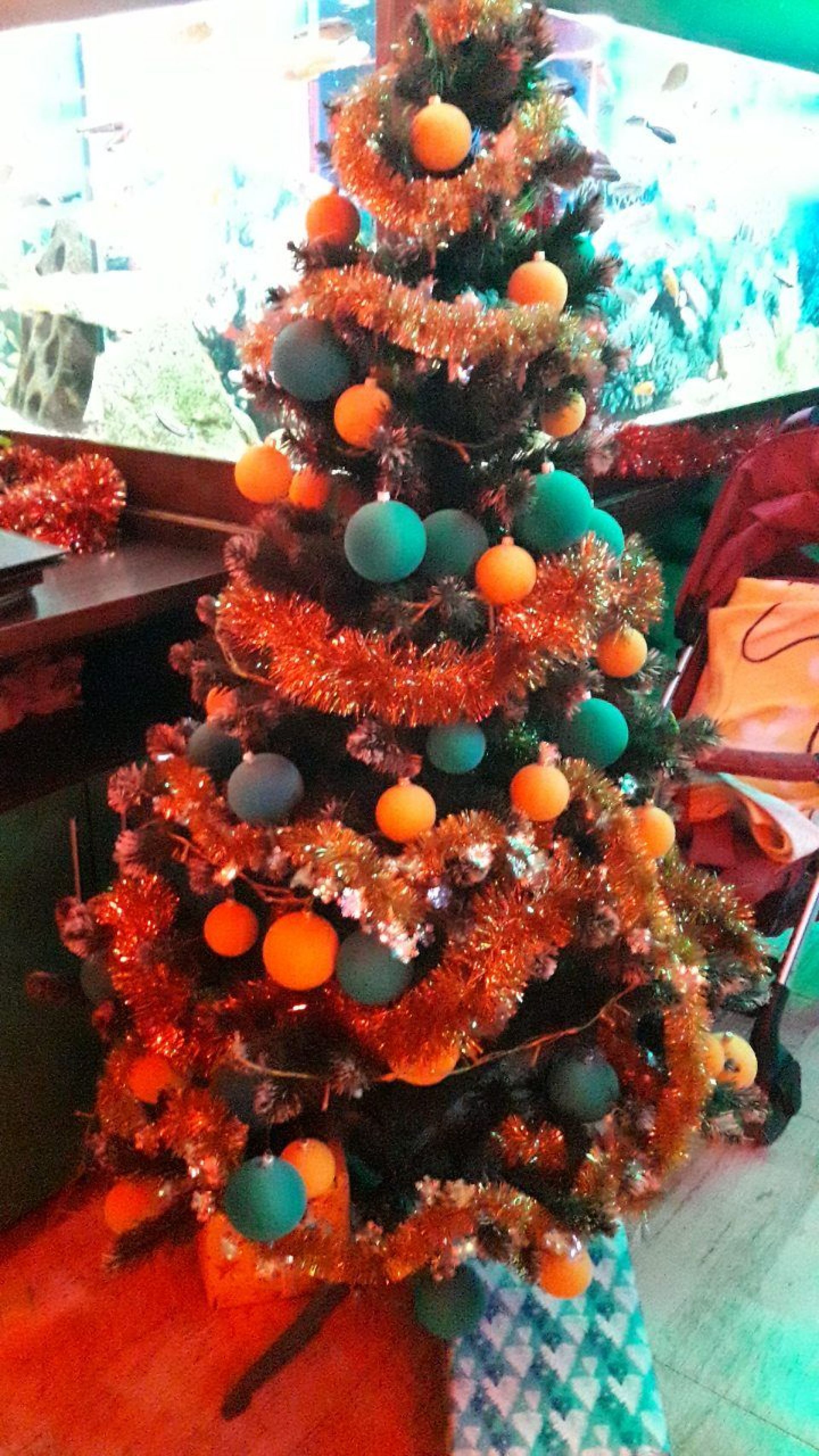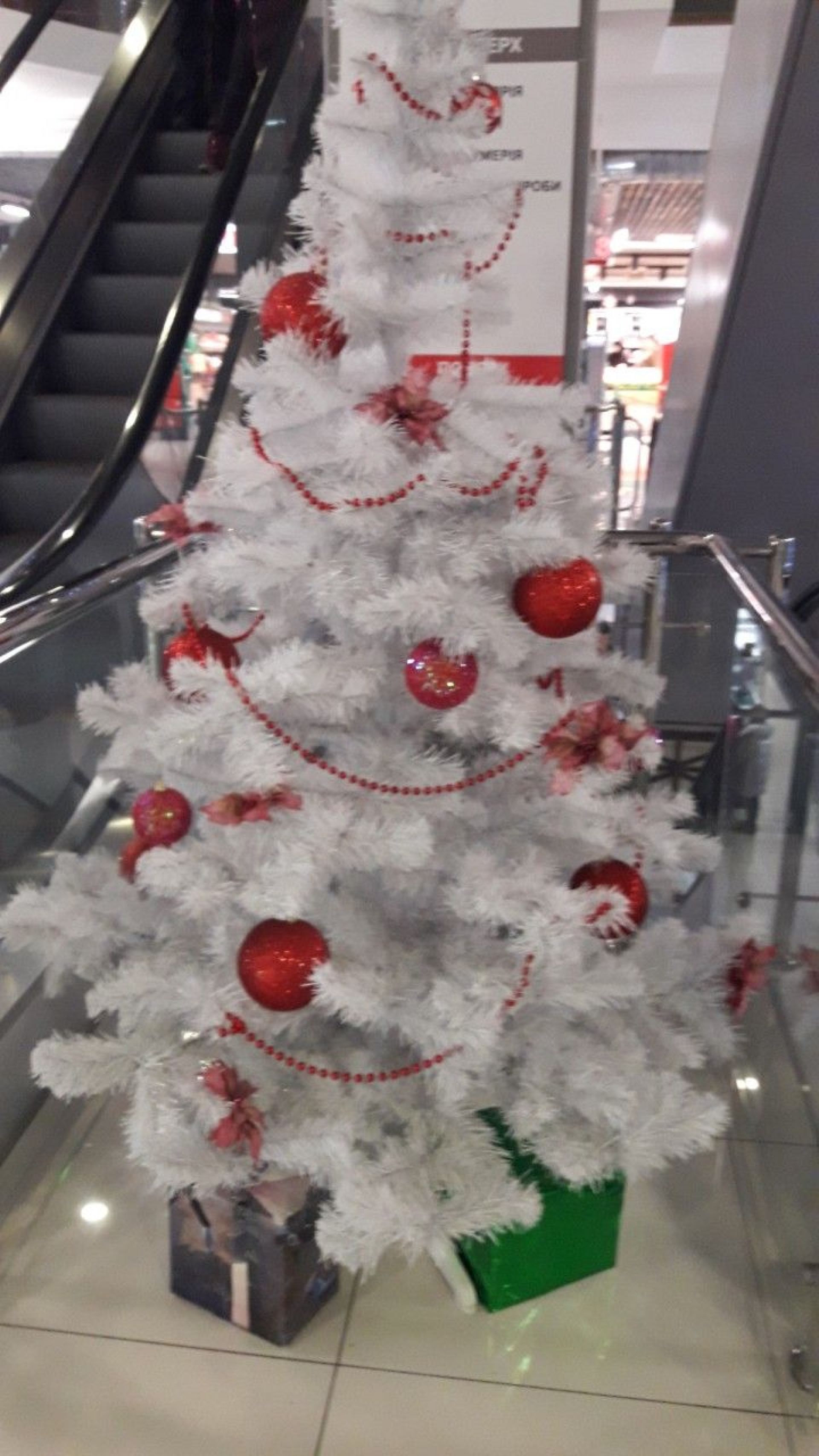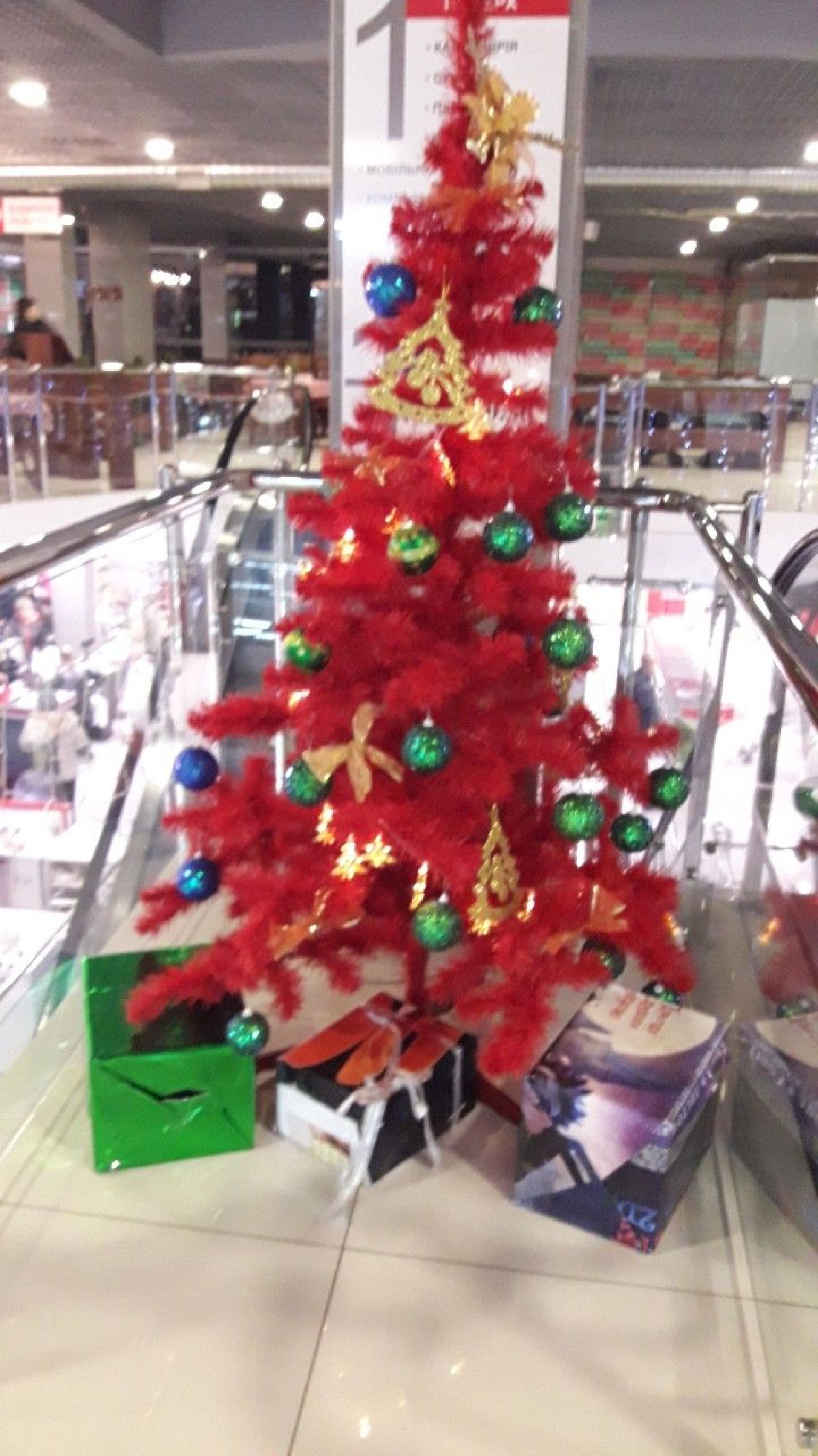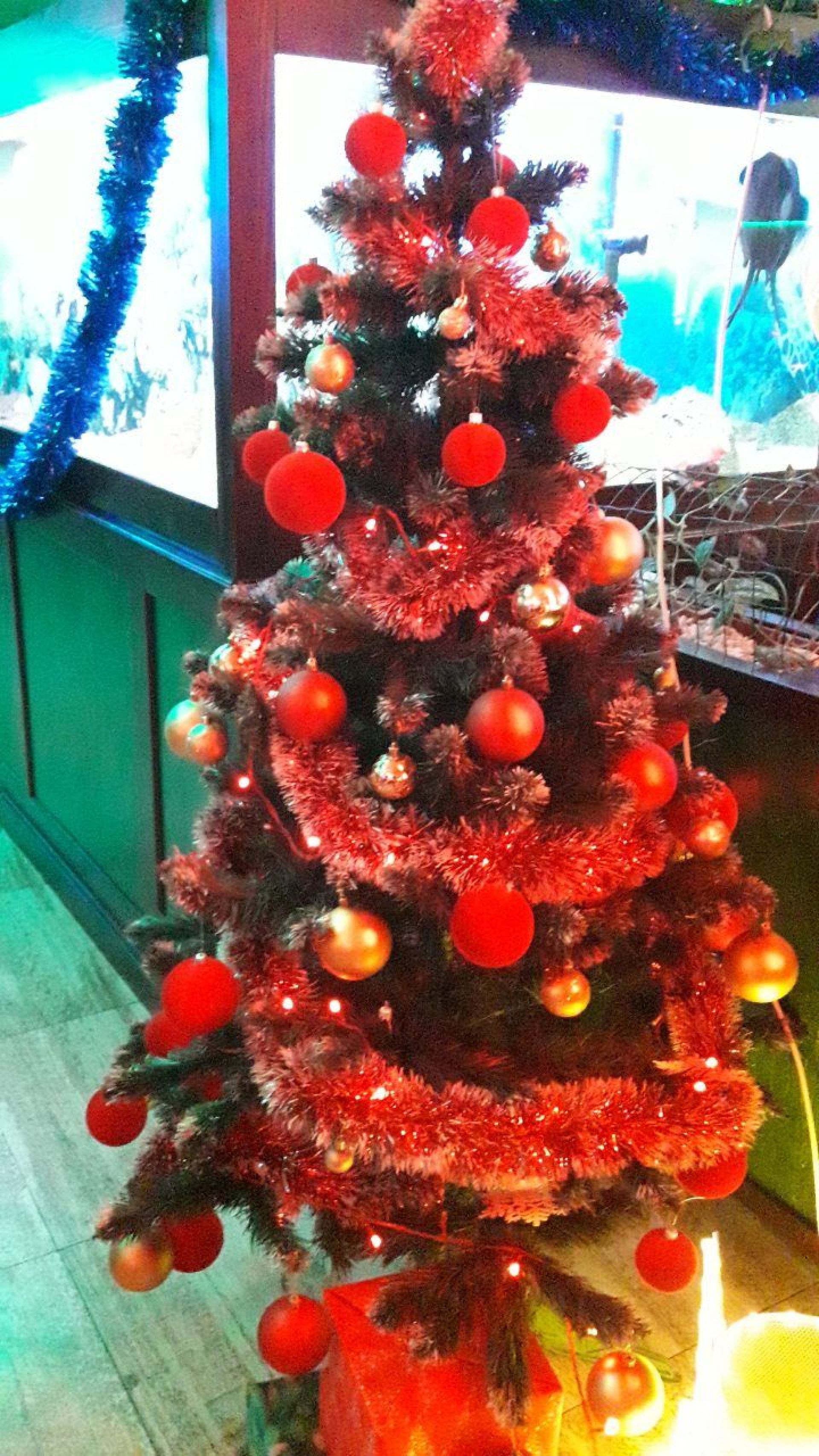 У одному з закладів харчування прикрашені ялинки стоять прямо на величезному акваріумі. Але здебільшого у громадських місцях стоять штучні, пухнасті сосни, прикрашені у двох-трьох тонах, з блискітками, дощиком та бантиками.
