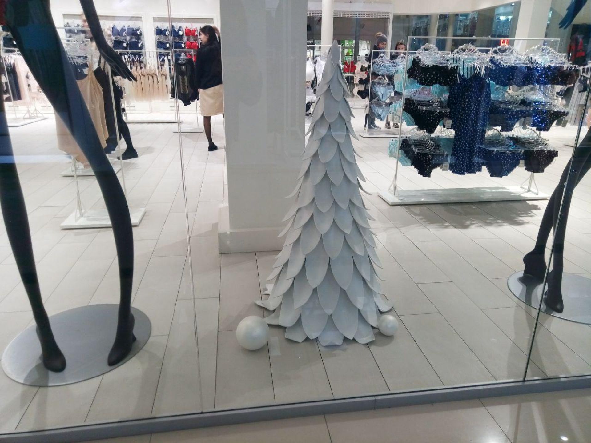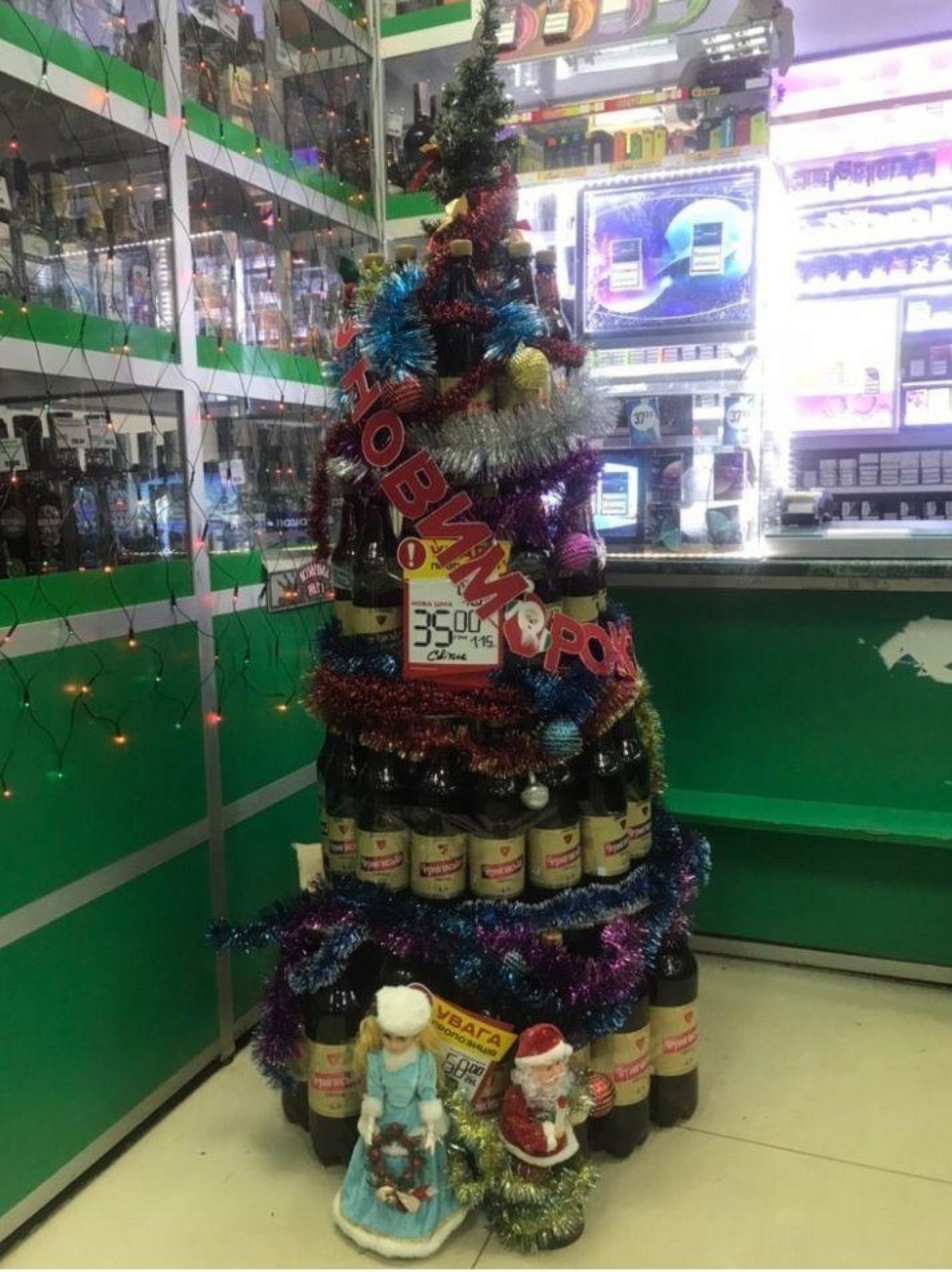 Деколи працівники та їх роботодавці підходять до справи дуже креативно, створюючи ялинки з паперу або дощику. У вітрині одного з розважальних центрів побачили пухнасту красуню зі звичайного дерев’яного трикутника. До неї додали гірлянду та декілька іграшок і вуаля - незвично, бюджетно і святково.