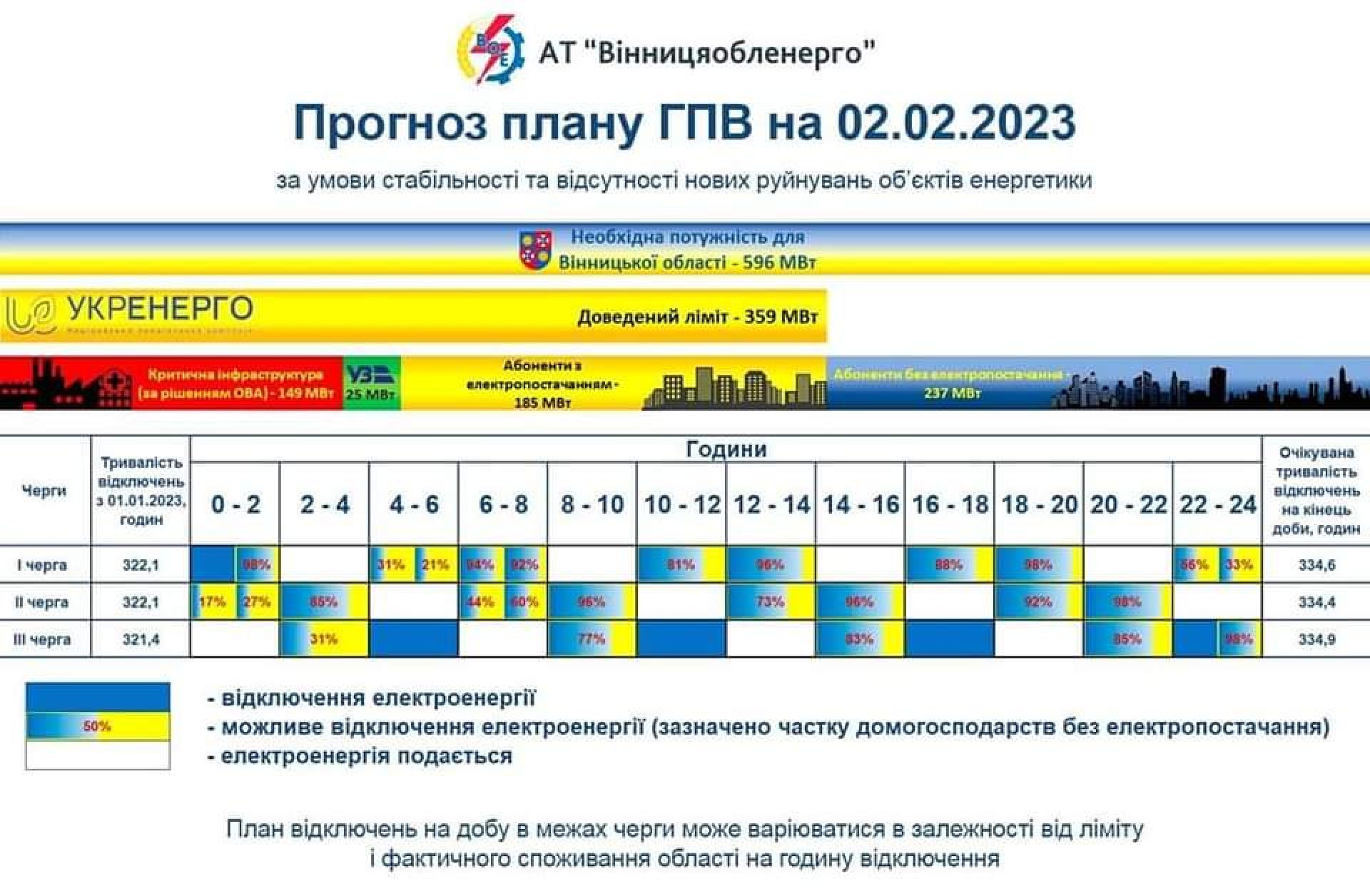 Як повідомляє «Вінницяобленерго», графік погодинних відключень світла до 10 лютого виглядає наступним чином (за умови стабільності та відсутності нових руйнувань об’єктів енергетики).