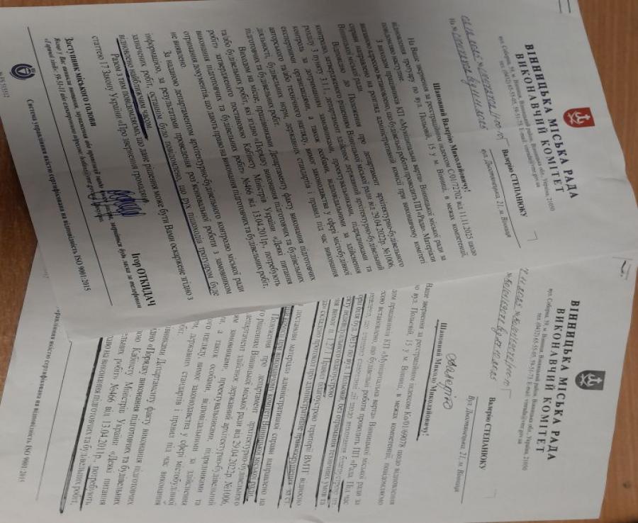У листі заступника міського голови Андрія Шпортуна сказано: «За порушення вимог Правил благоустрою території відносно директора ПП «Рада» складено протокол про адміністративне правопорушення за ст. 152 КУпАП. Для винесення постанови матеріали адміністративної справи направлено на розгляд адмінкомісії при виконкомі Вінницької міськради».