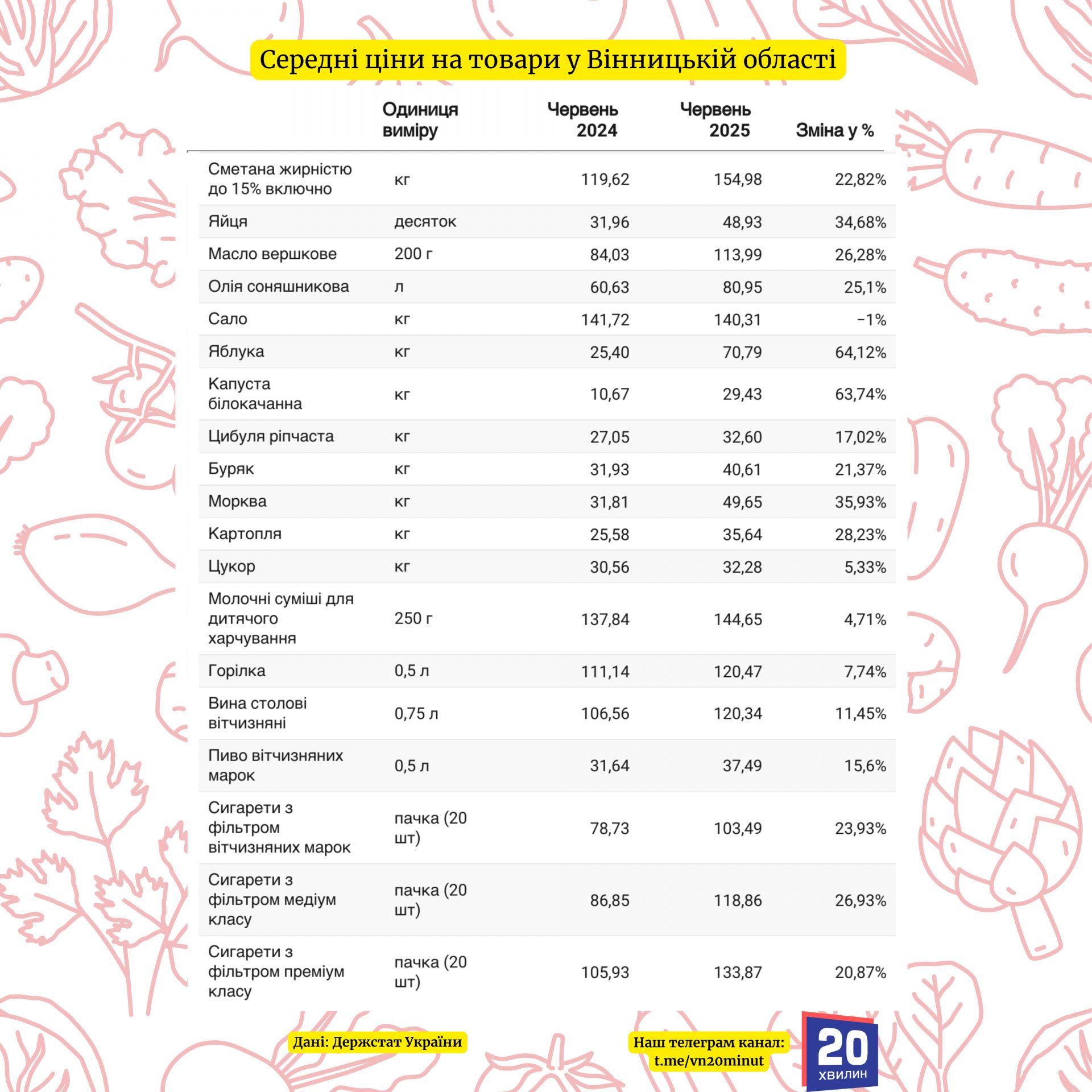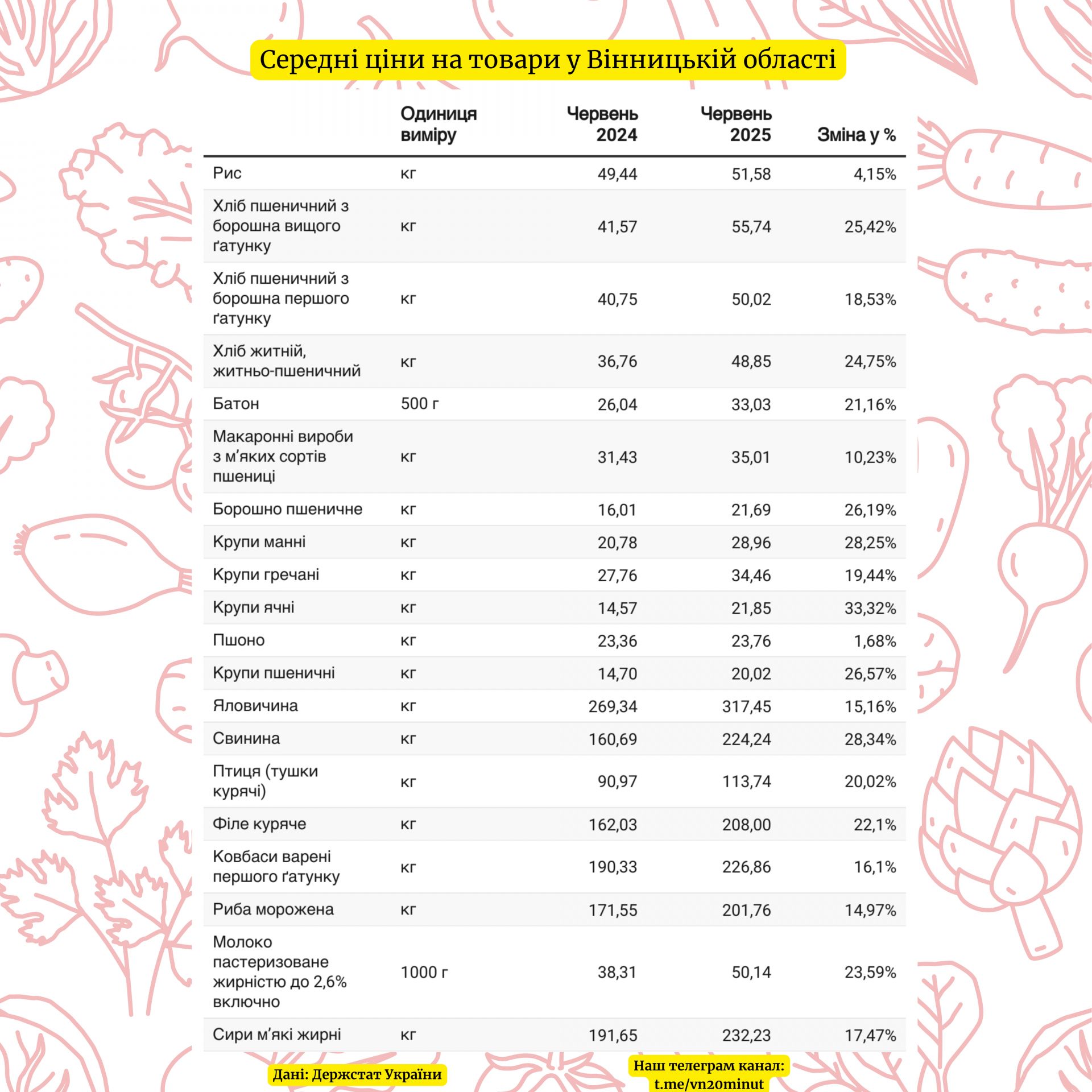 Ми проаналізували офіційну статистику цін від Держстату на продукти у Вінницькій області за червень 2024 та червень 2025 року. Результати — подекуди вражають.