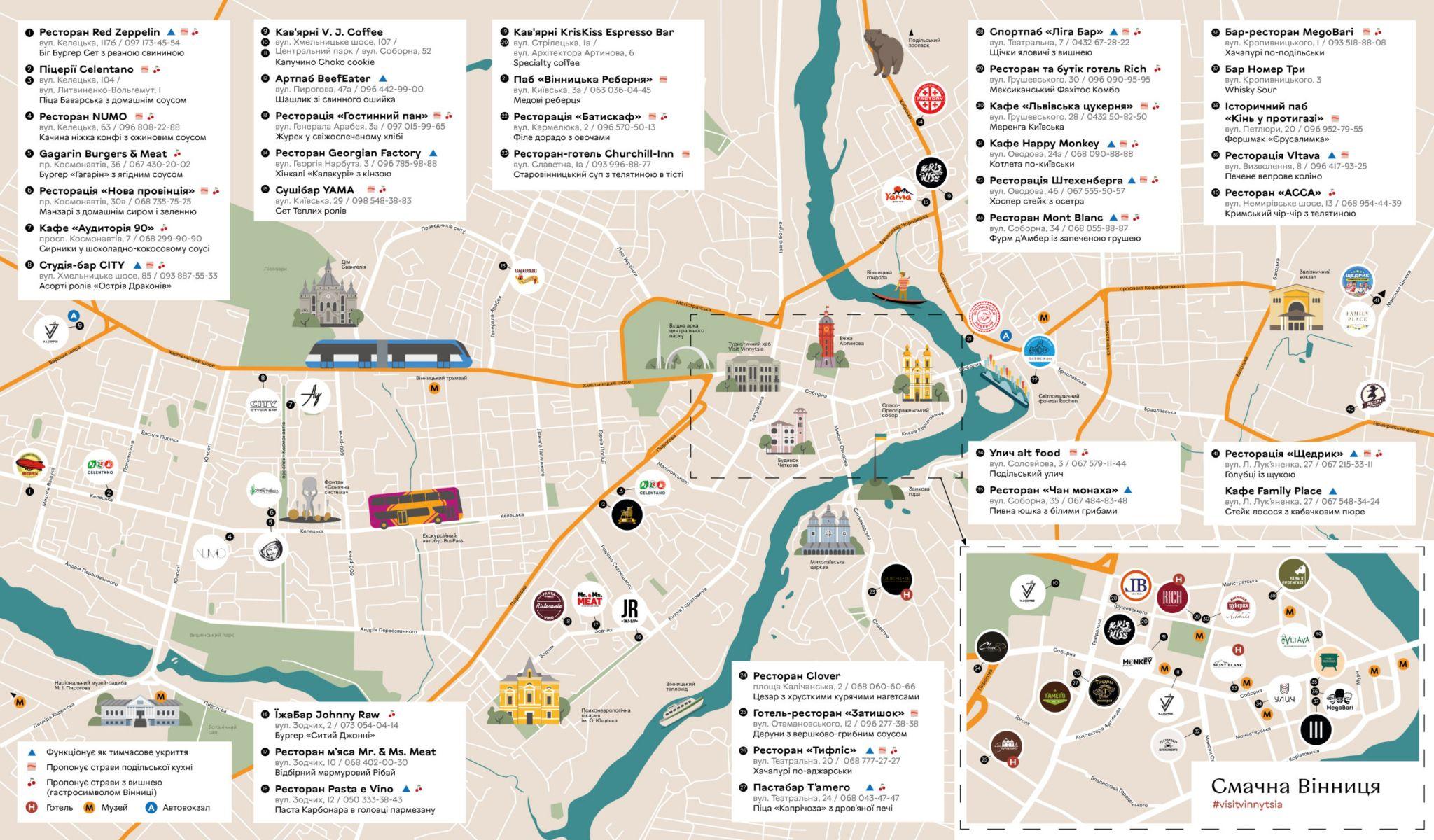 У Вінниці презентували першу міську гастрономічну мапу «Смачна Вінниця». Це нова туристична карта міста, на якій позначено 38 закладів гостинності (ресторанів, барів та кав’ярень).