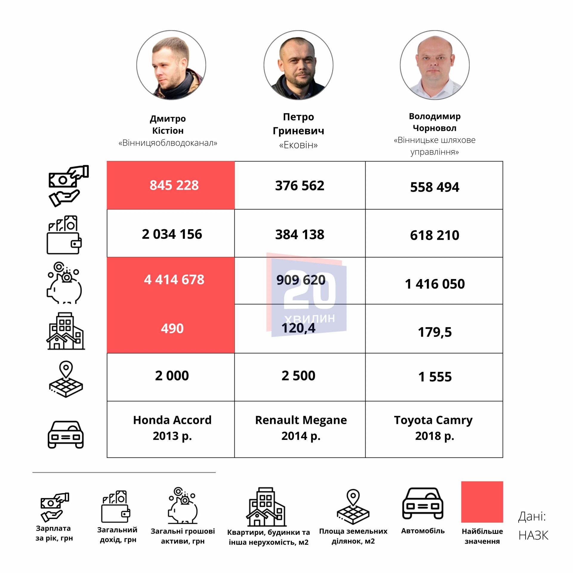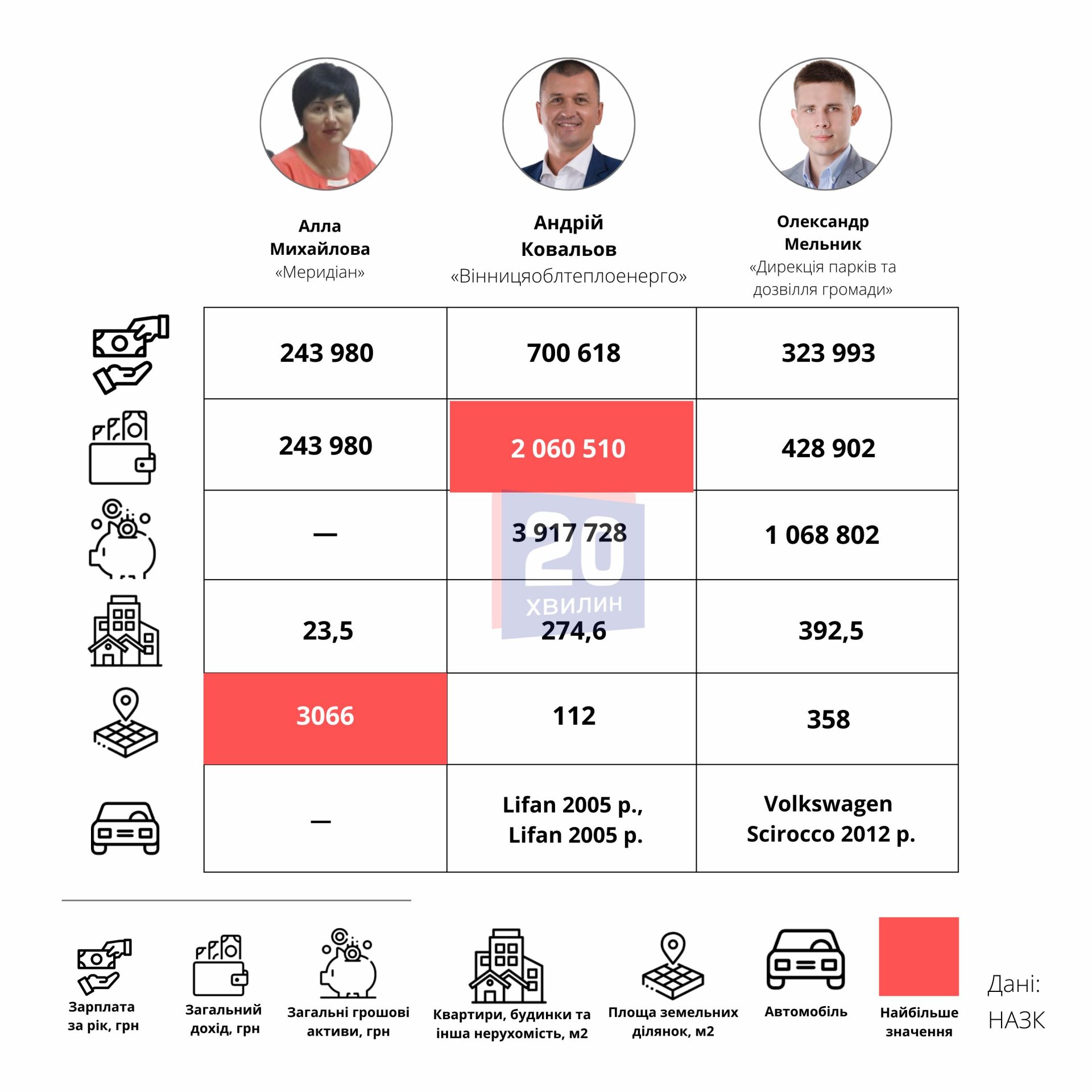 Найбільші заощадження — у гендиректора «Вінницяміськтеплоенерго» Максима Білика: 6,2 мільйона гривень. Тоді як в Олександра Нечаєва найбільше нерухомості (138,7 кв.метрів), а у керівниці «Вінницязеленбуд» Тетяни Прибиш — найбільше землі (20 тисяч кв.метрів).