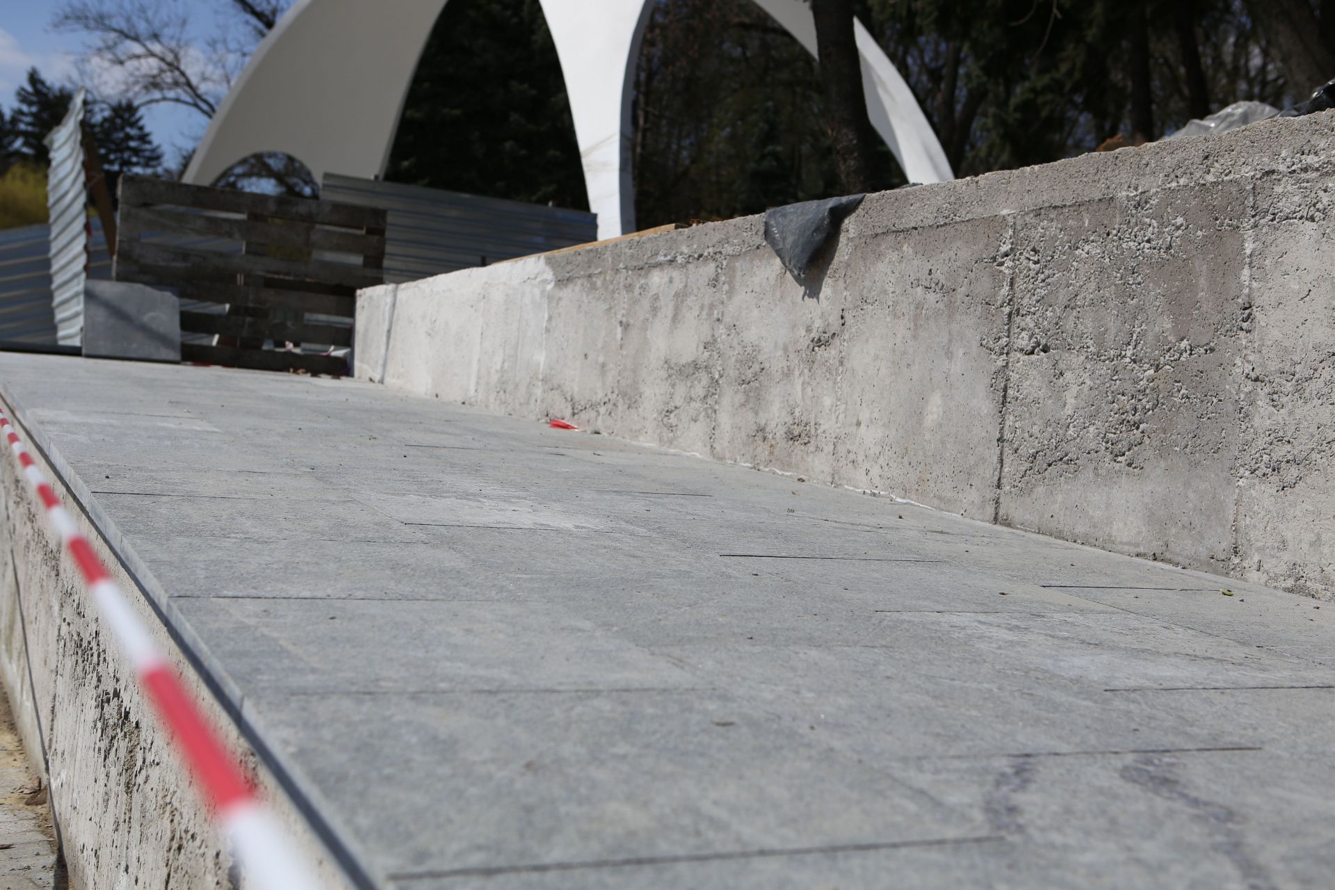 За початковим проектом пандуси мали облаштувати по обидва боки від Арки. Але роботи ведуться лише з однієї сторони і тільки на першому рівні сходів.