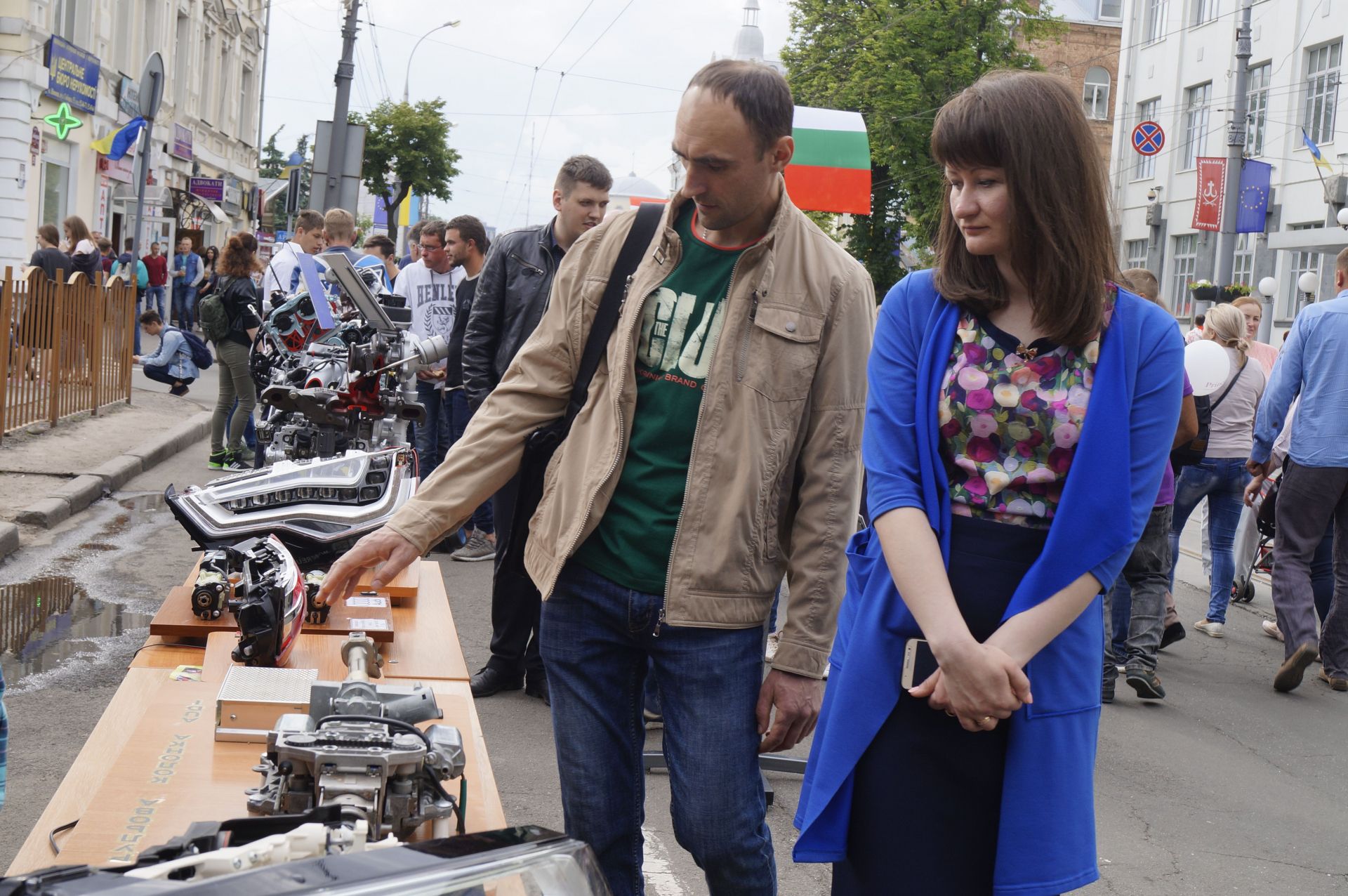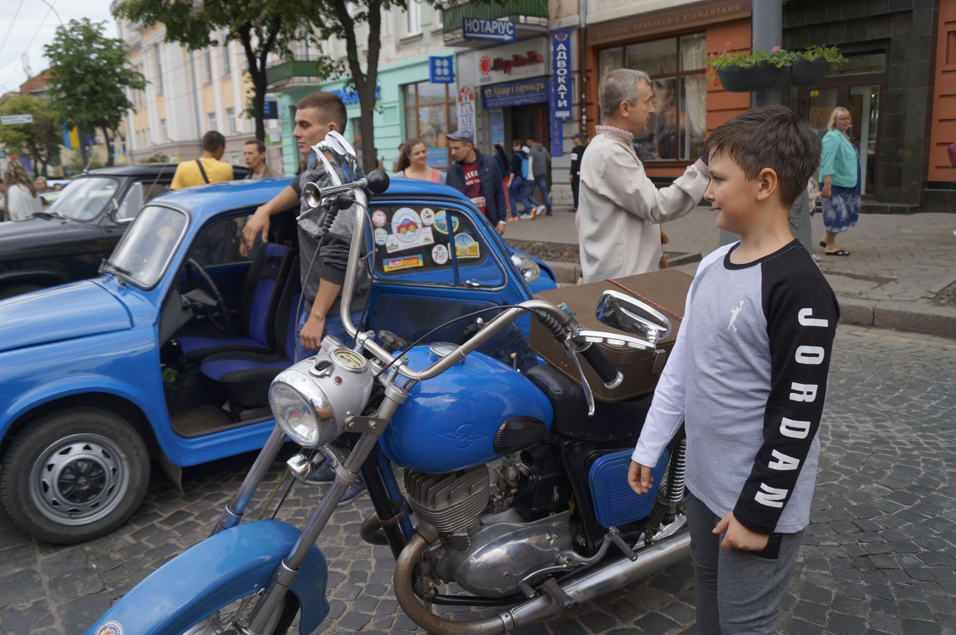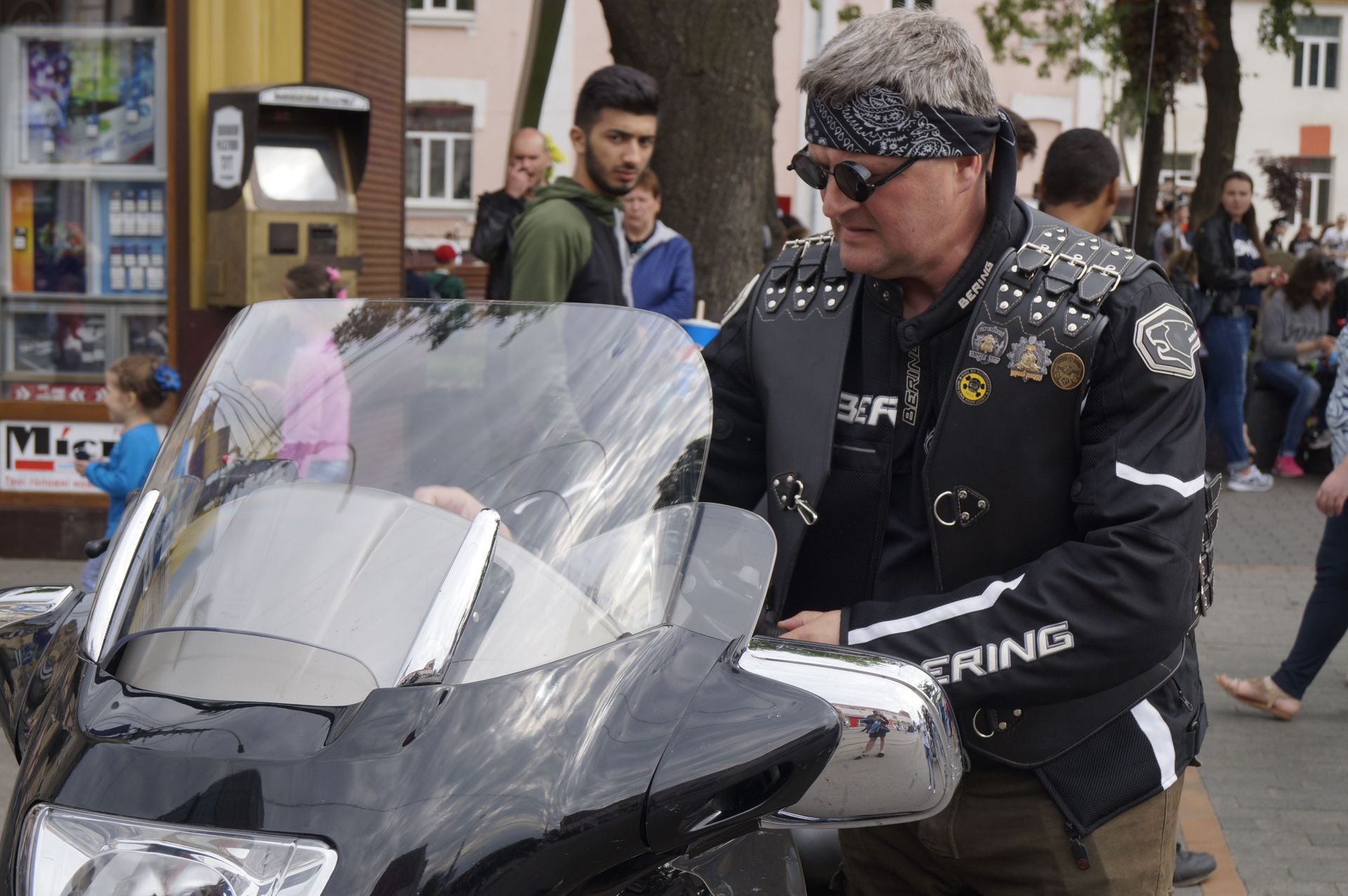 Вінничани Ігор та Катерина сфотографувались на мотоциклі. Прийшли на свято після зустрічі в Костелі. Розповідають, що на Дні Європи вони не вперше і їм все подобається.