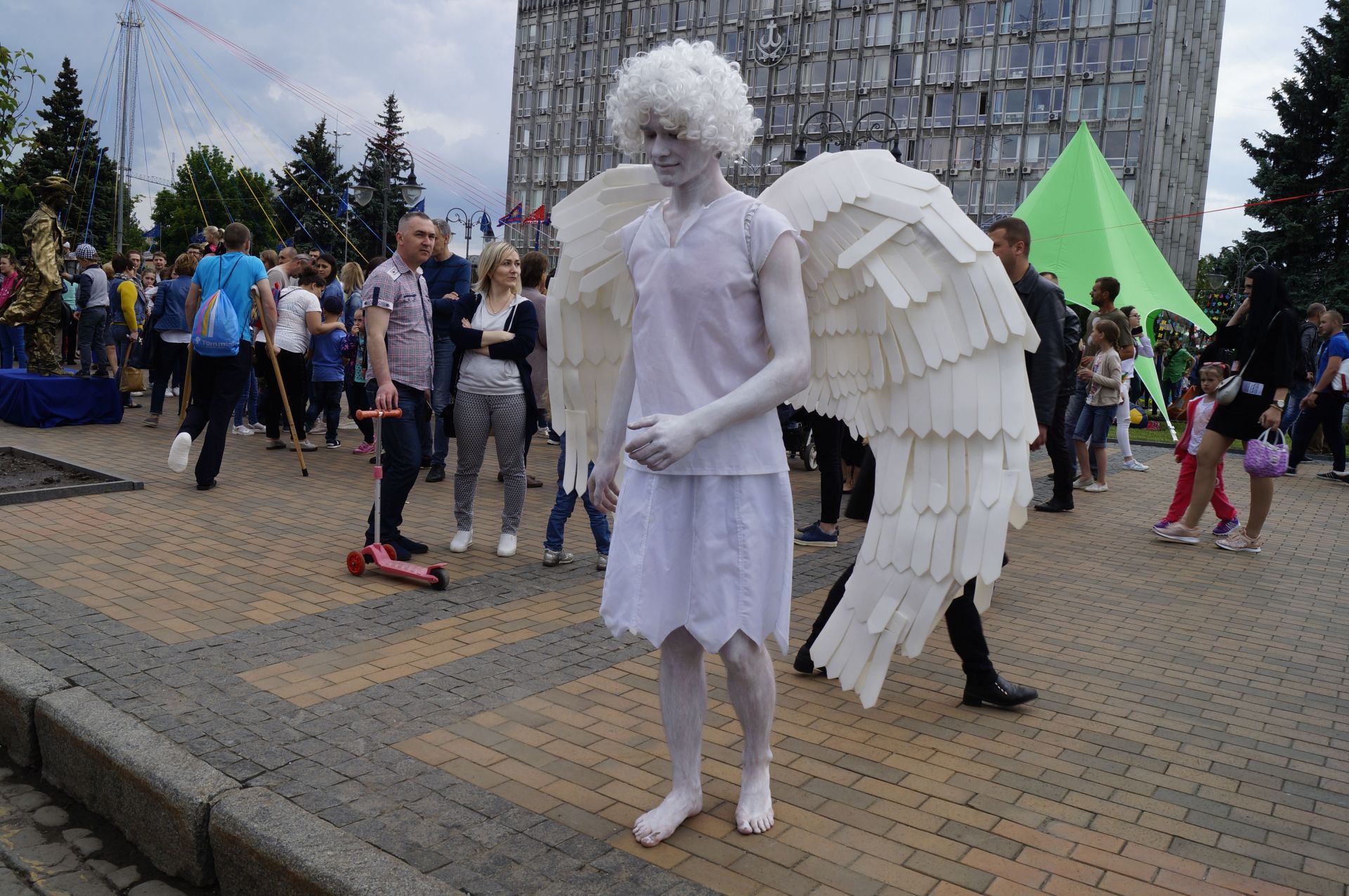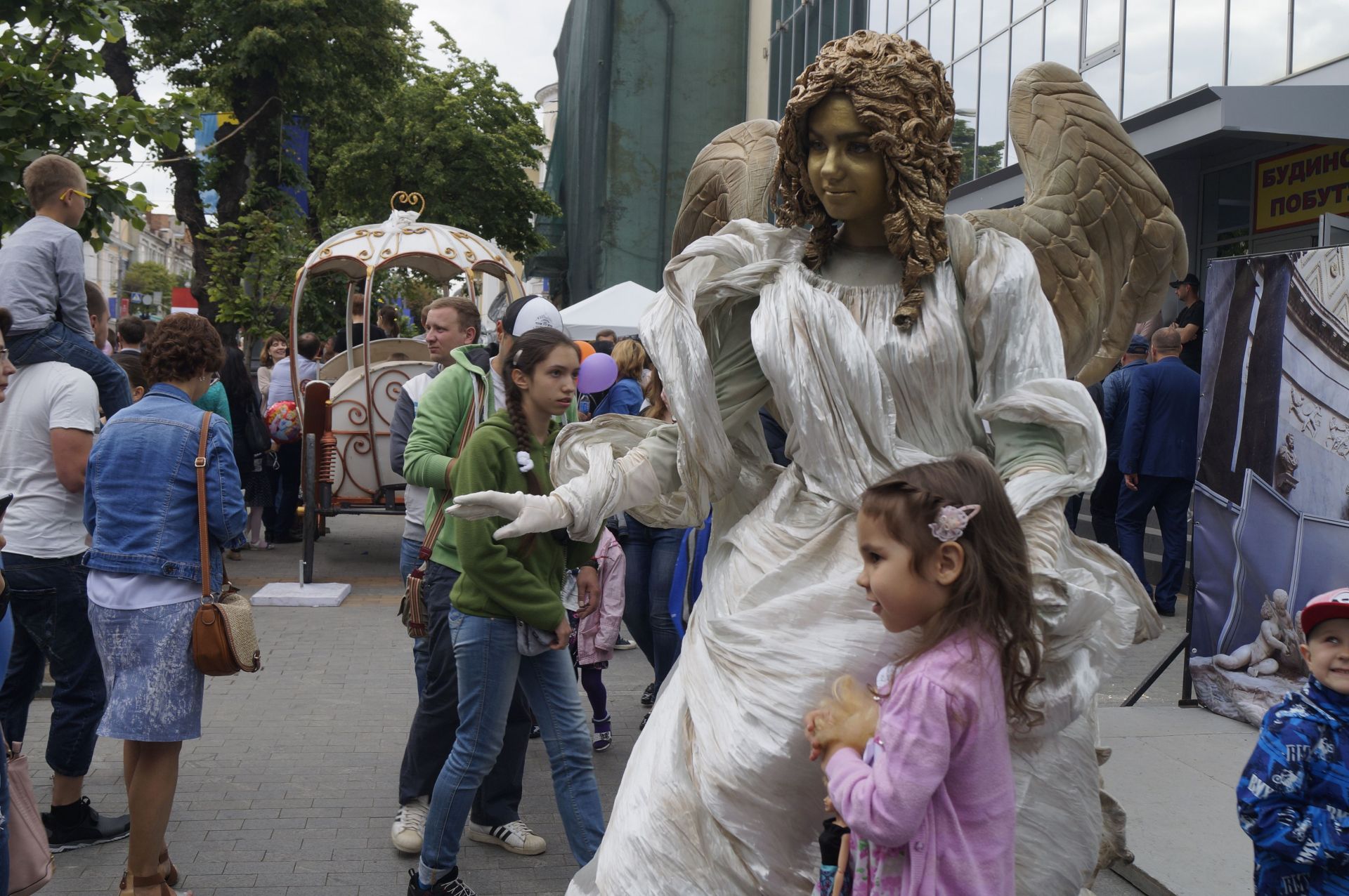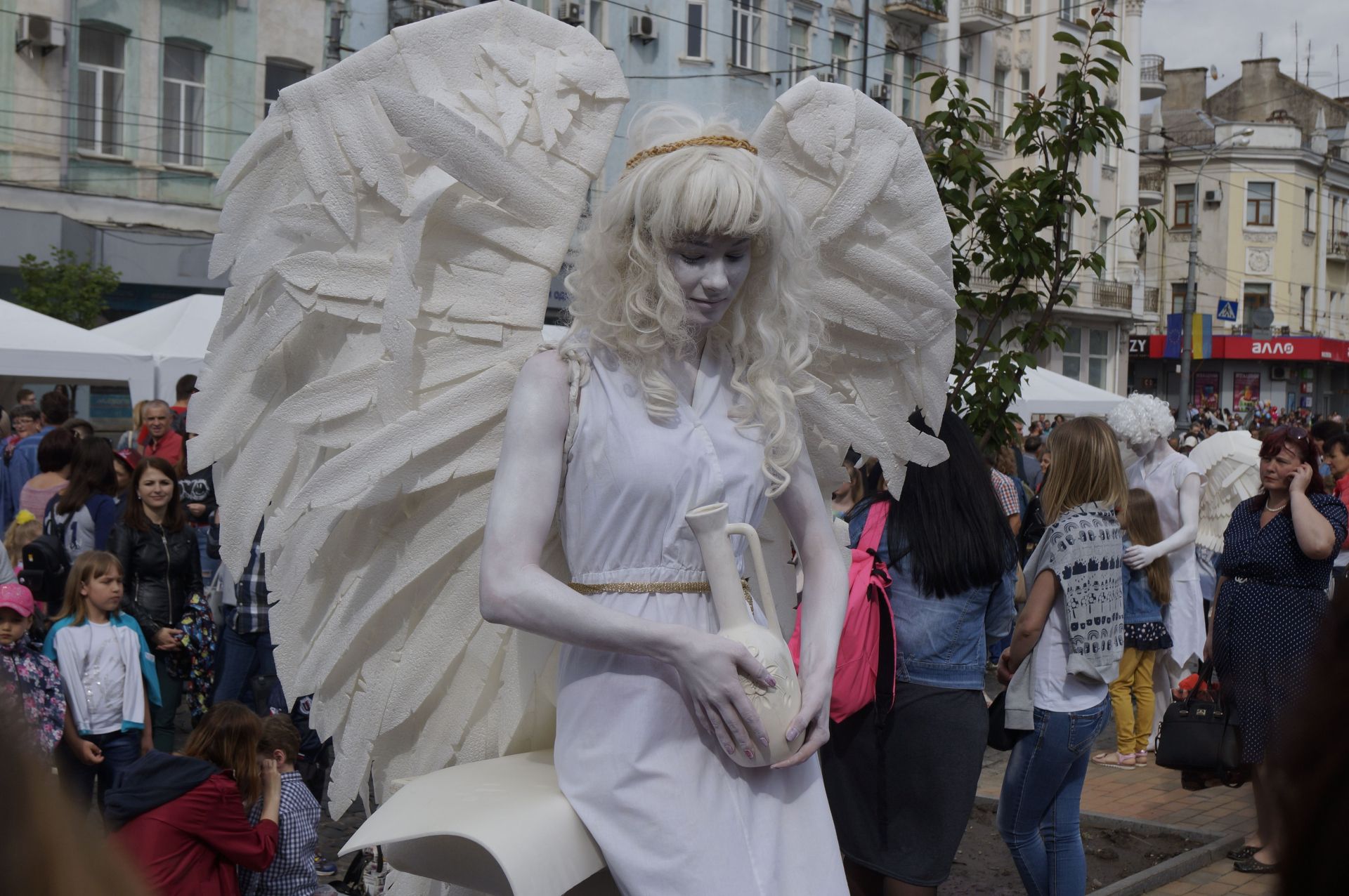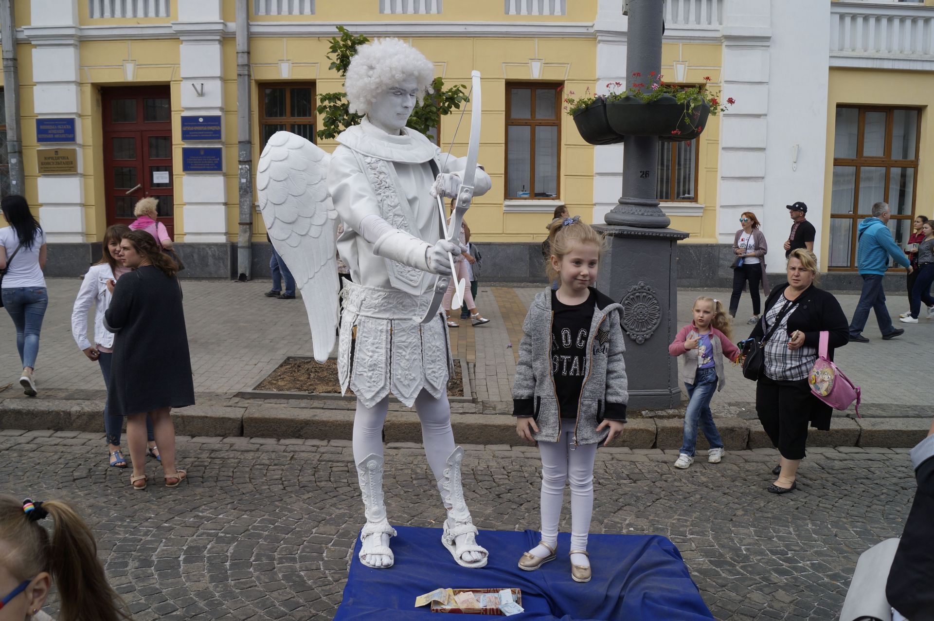Для фото з живими скульптурами вишиковувались цілі черги. «Скульптури» - це не лише вінничани, але й гості з інших міст. Наприклад, янголи приїхали до нас з Одеси. Вони залиши площу раніше інших, забравши з собою коробки з дрібними грошима, які їм залишали перехожі. Дорогою до них вчепився чоловік напідпитку.