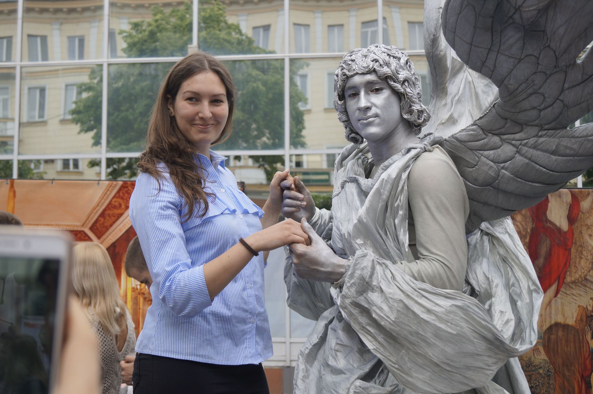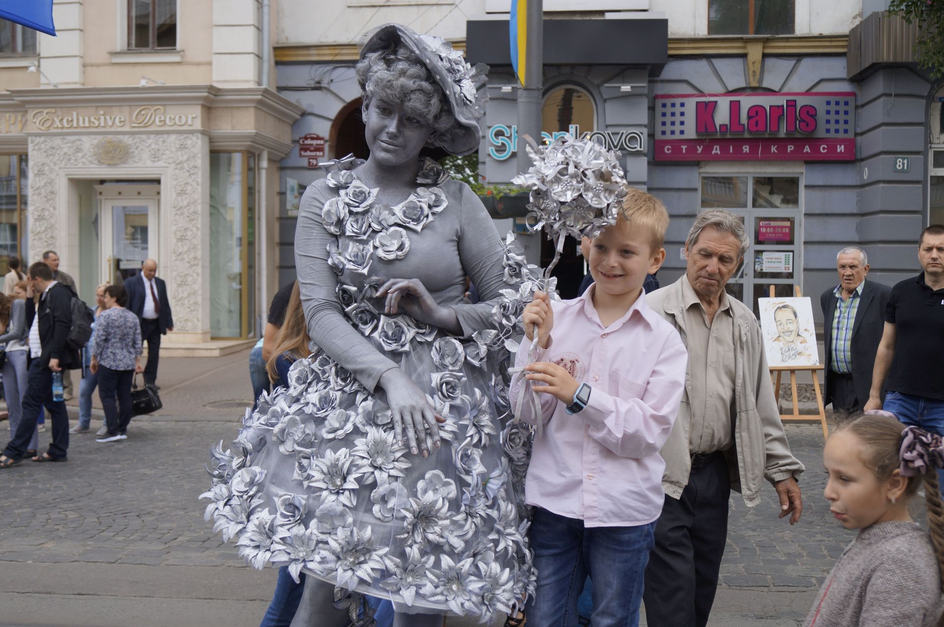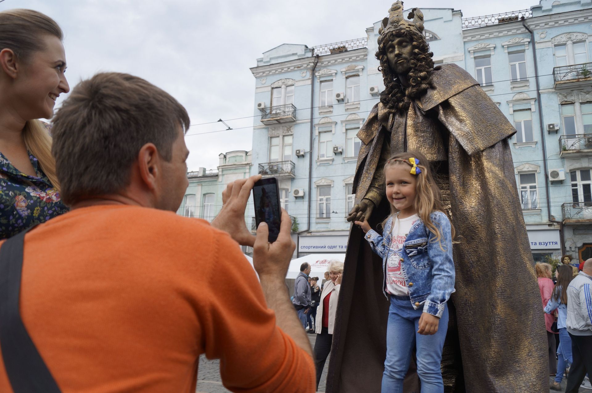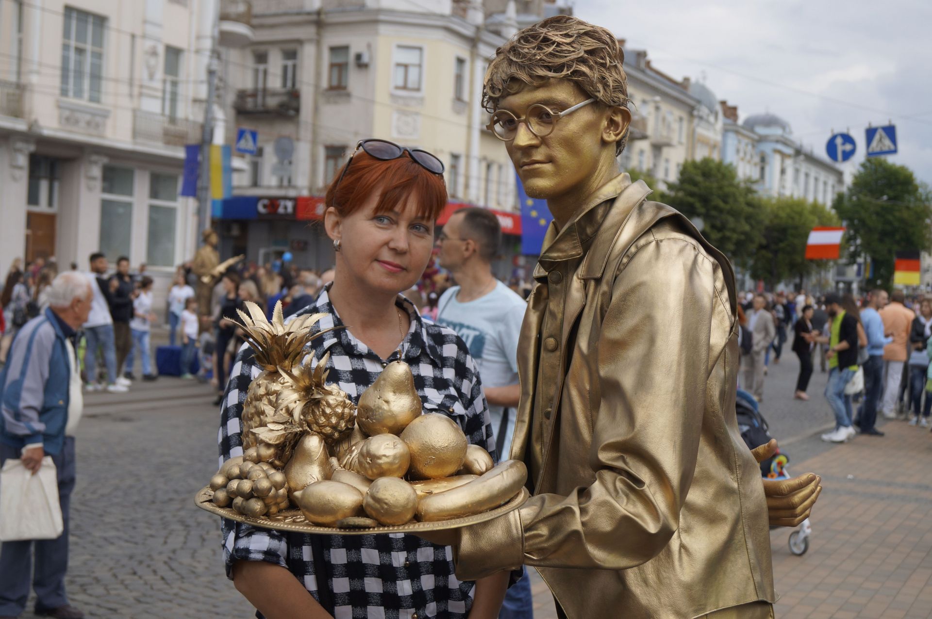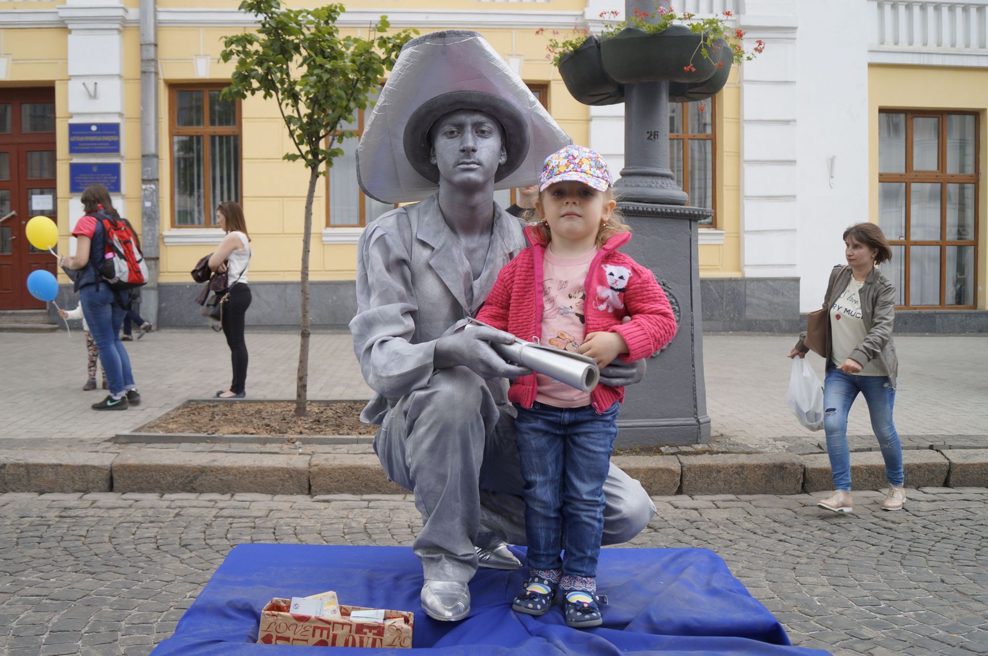 Для фото з живими скульптурами вишиковувались цілі черги. «Скульптури» - це не лише вінничани, але й гості з інших міст. Наприклад, янголи приїхали до нас з Одеси. Вони залиши площу раніше інших, забравши з собою коробки з дрібними грошима, які їм залишали перехожі. Дорогою до них вчепився чоловік напідпитку.