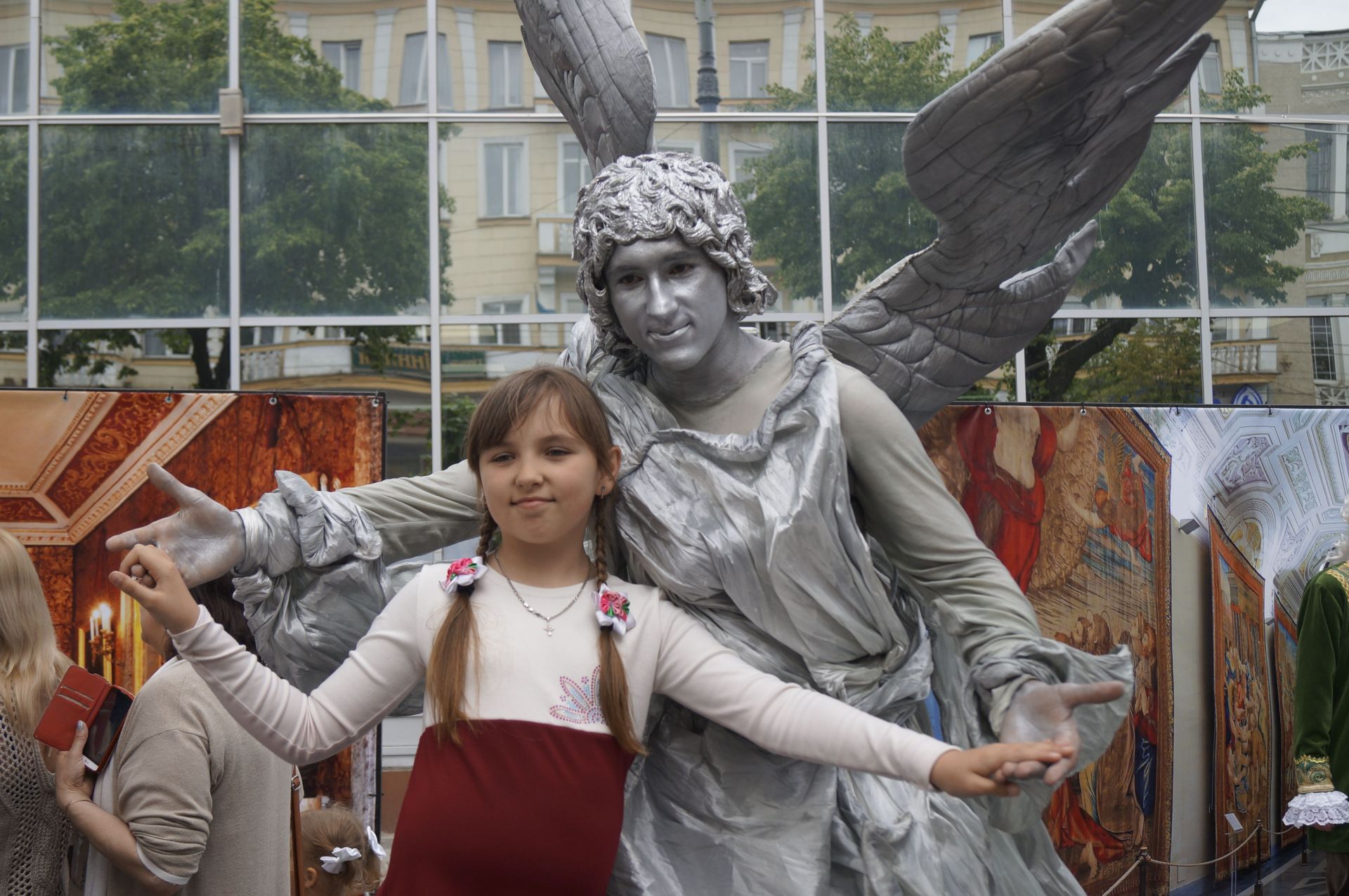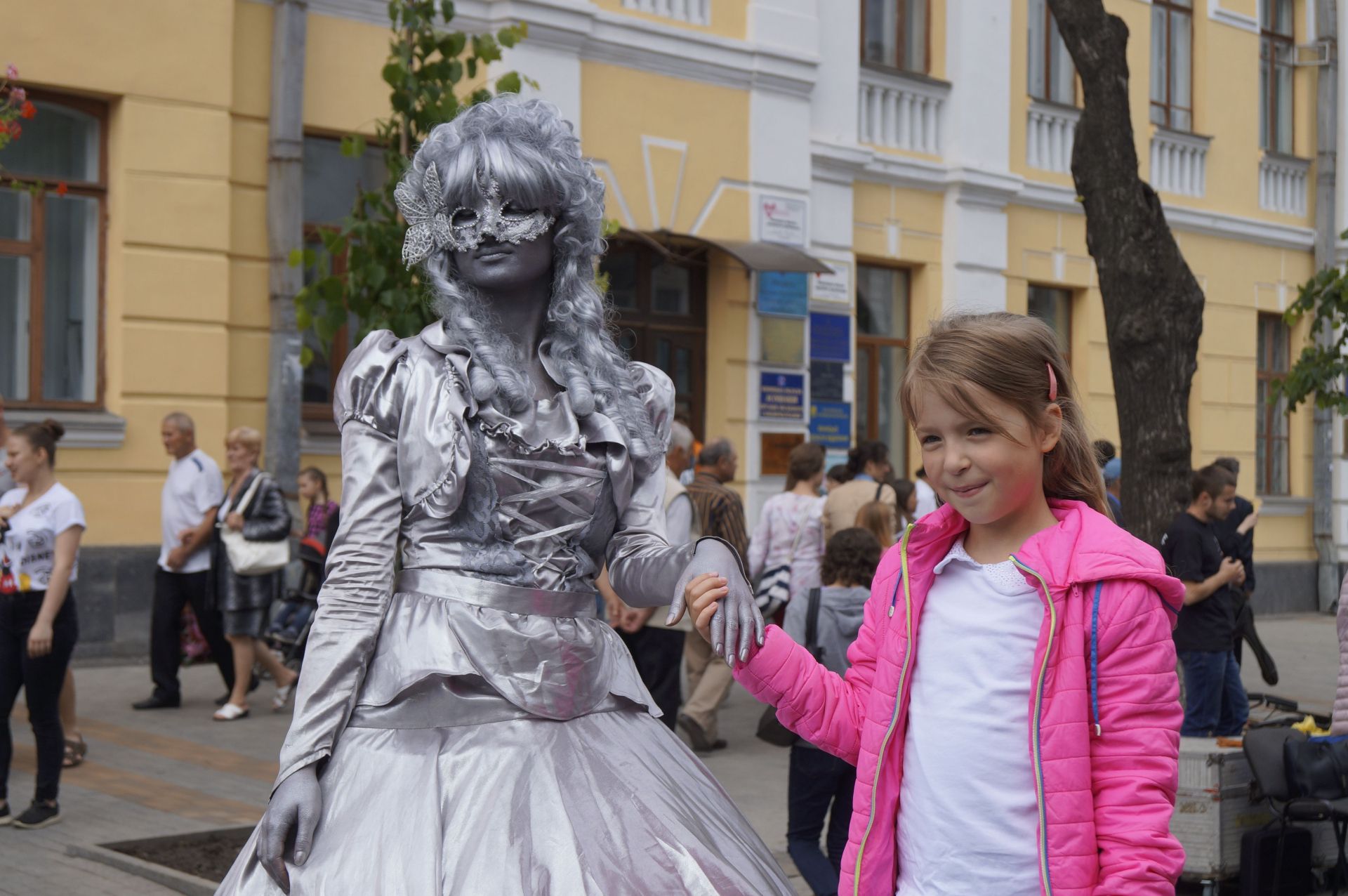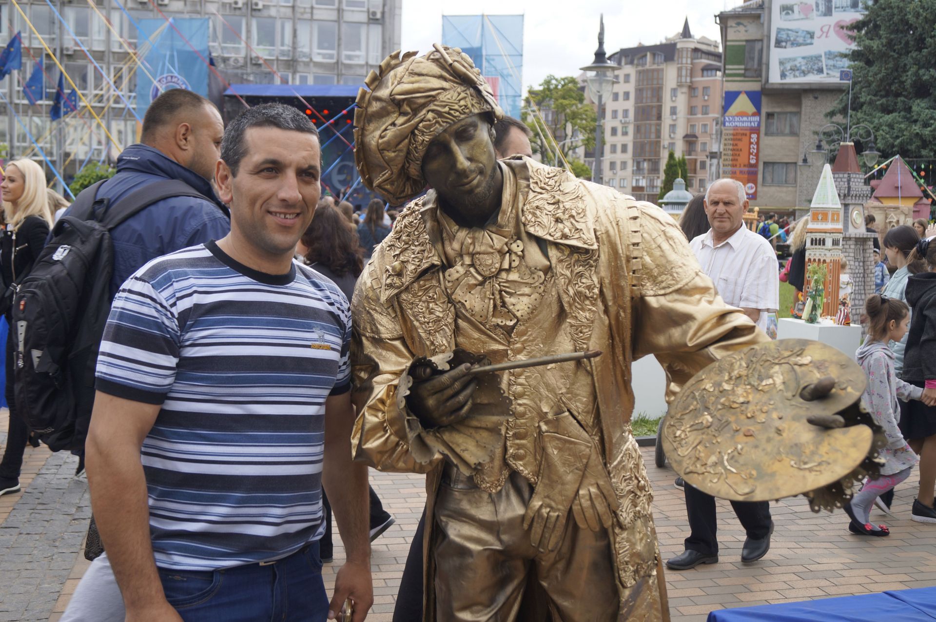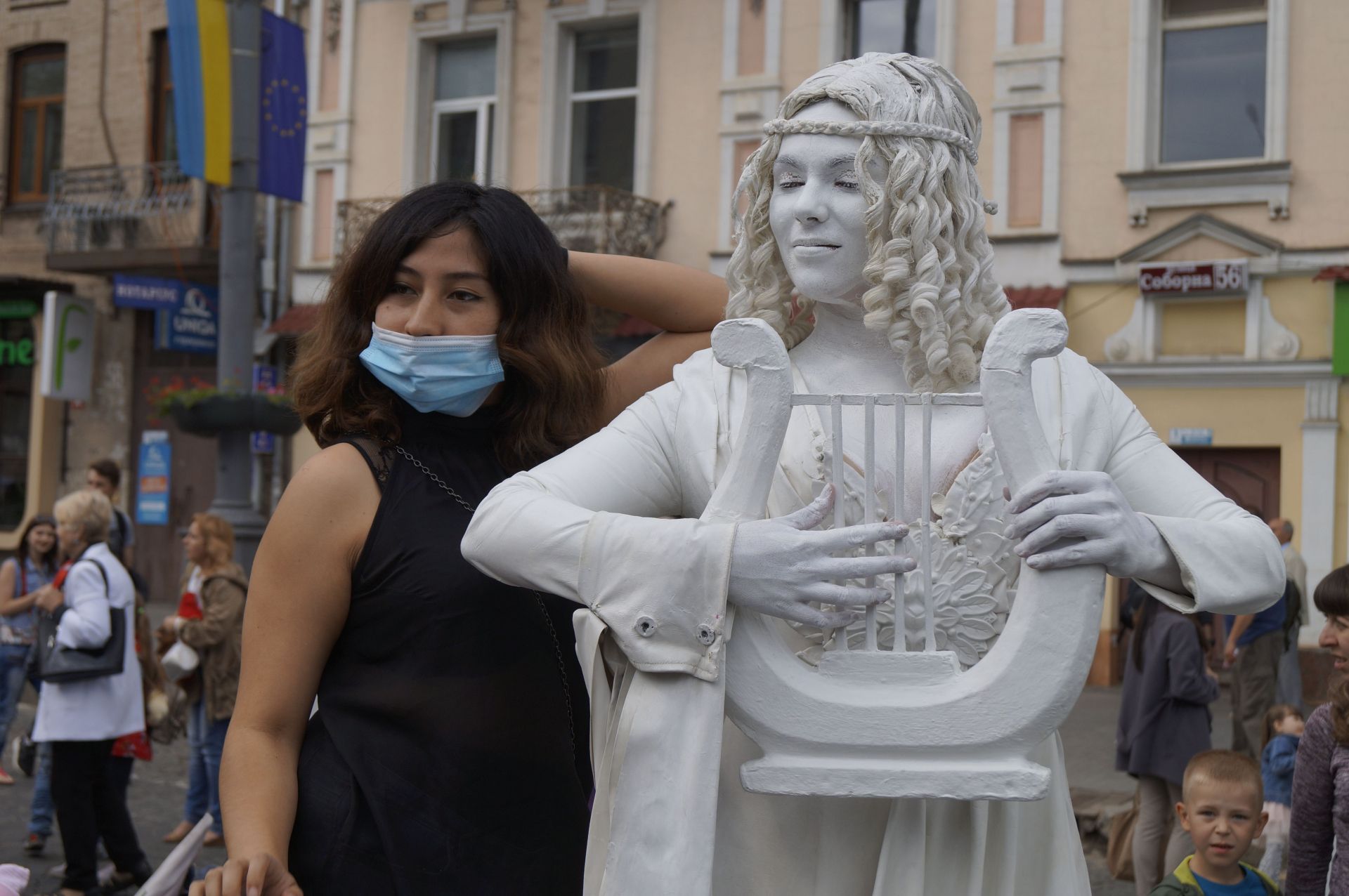 Для фото з живими скульптурами вишиковувались цілі черги. «Скульптури» - це не лише вінничани, але й гості з інших міст. Наприклад, янголи приїхали до нас з Одеси. Вони залиши площу раніше інших, забравши з собою коробки з дрібними грошима, які їм залишали перехожі. Дорогою до них вчепився чоловік напідпитку.