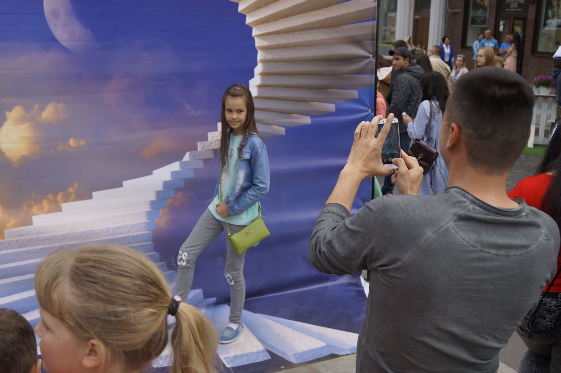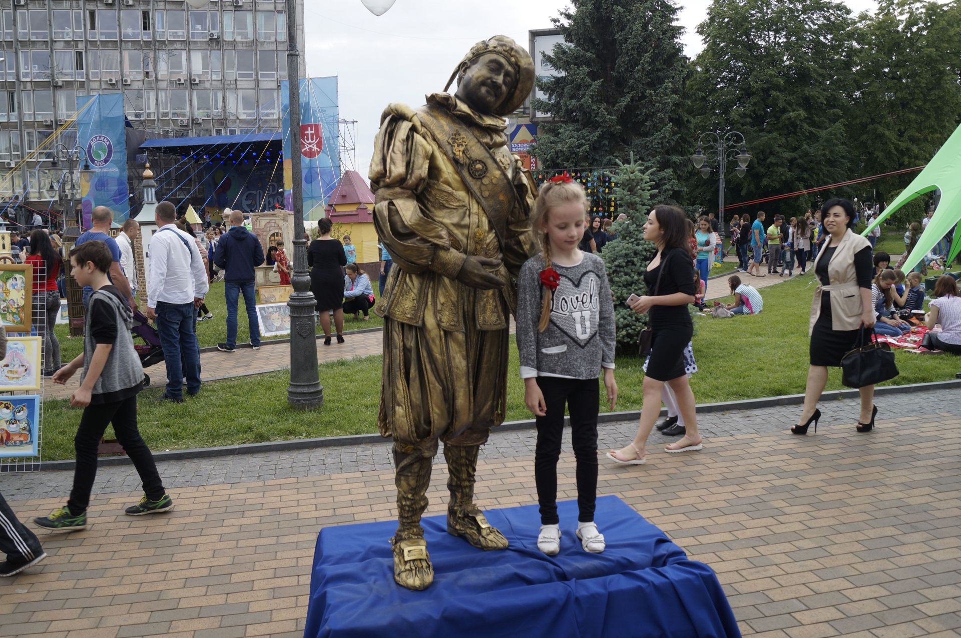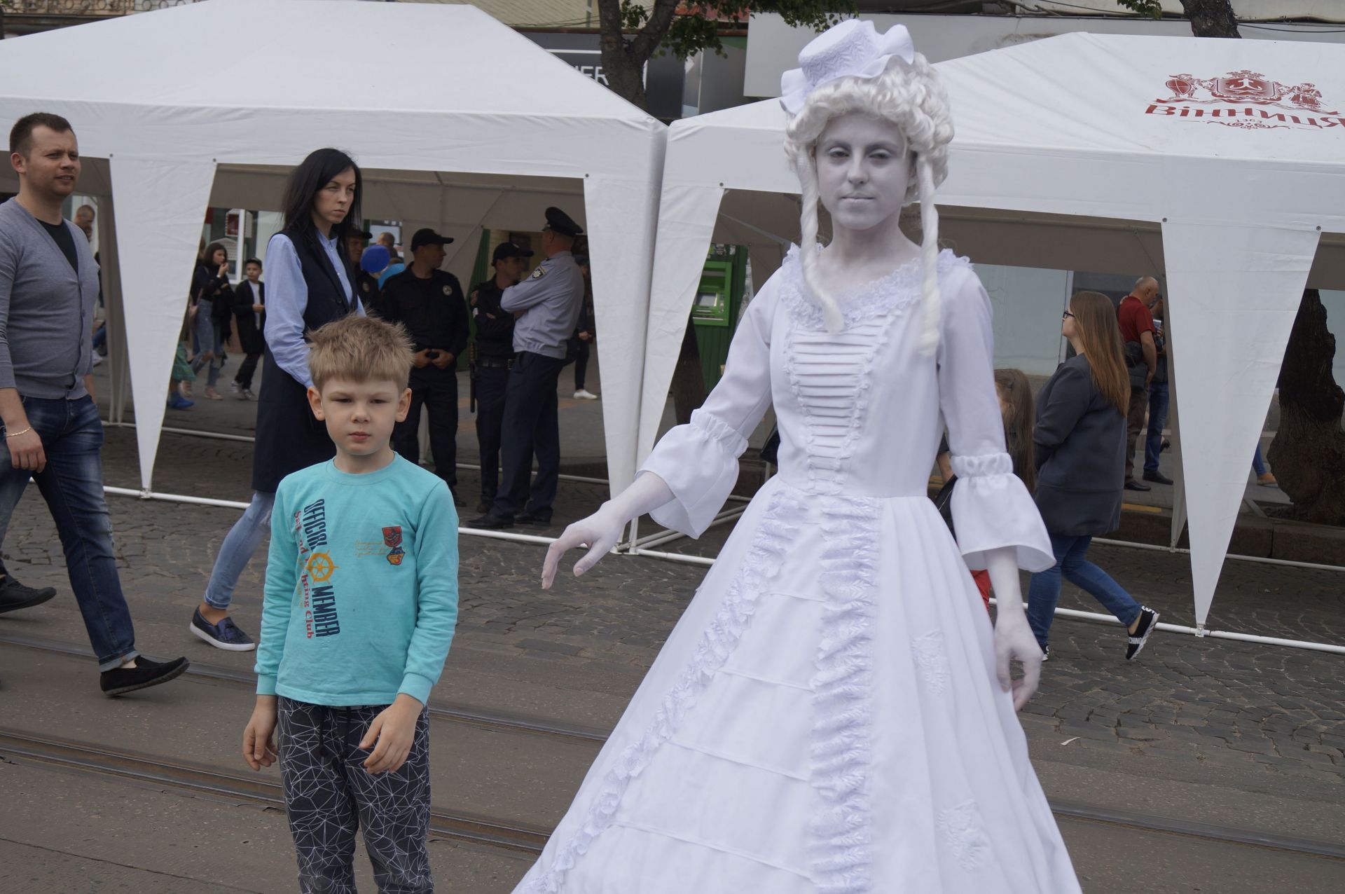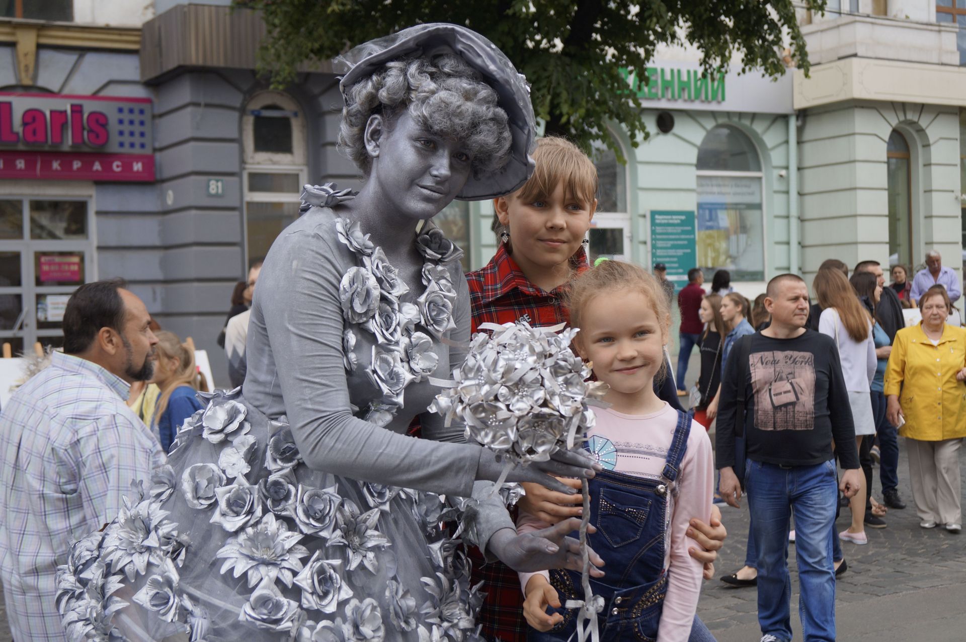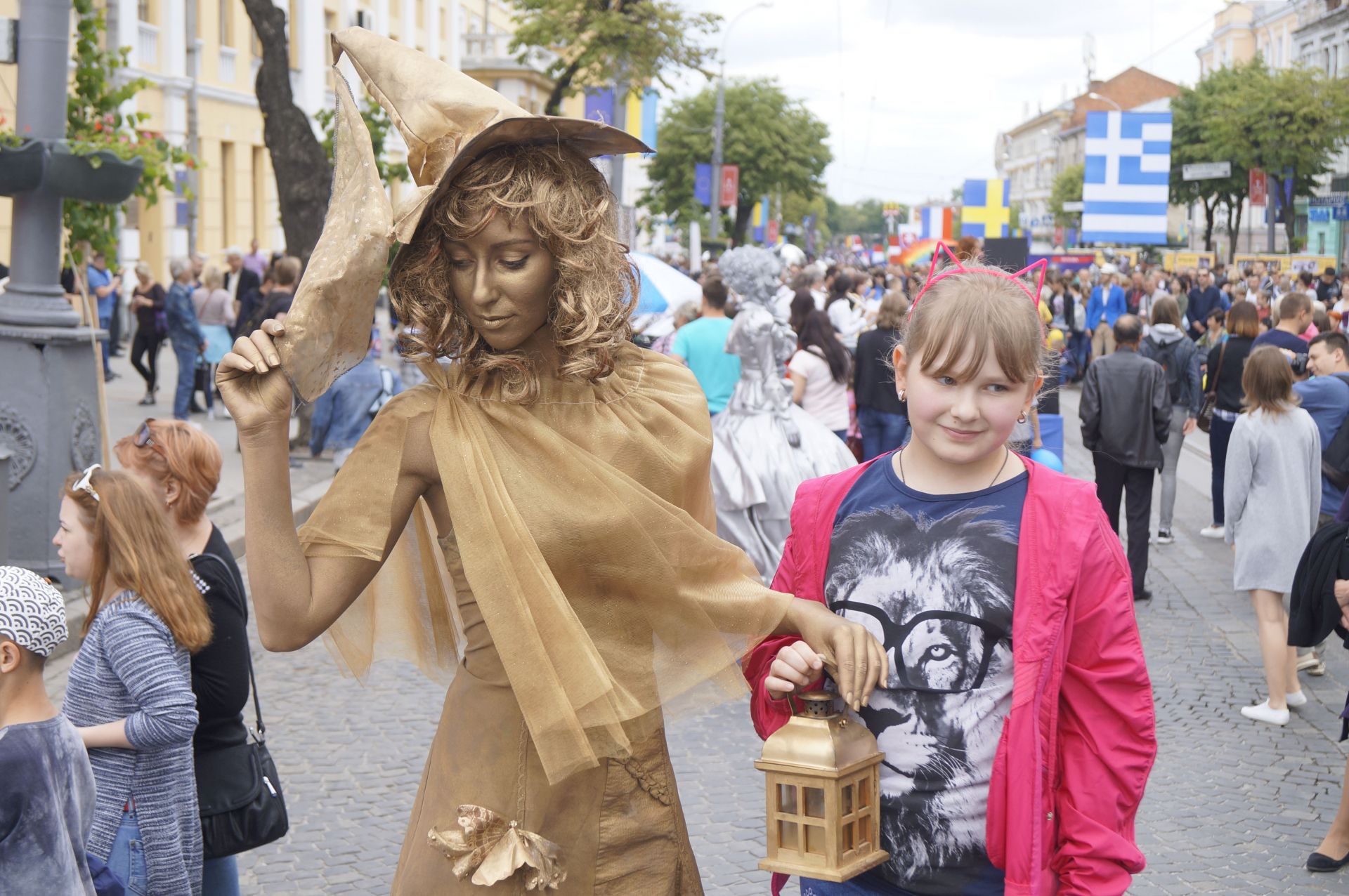 Для фото з живими скульптурами вишиковувались цілі черги. «Скульптури» - це не лише вінничани, але й гості з інших міст. Наприклад, янголи приїхали до нас з Одеси. Вони залиши площу раніше інших, забравши з собою коробки з дрібними грошима, які їм залишали перехожі. Дорогою до них вчепився чоловік напідпитку.