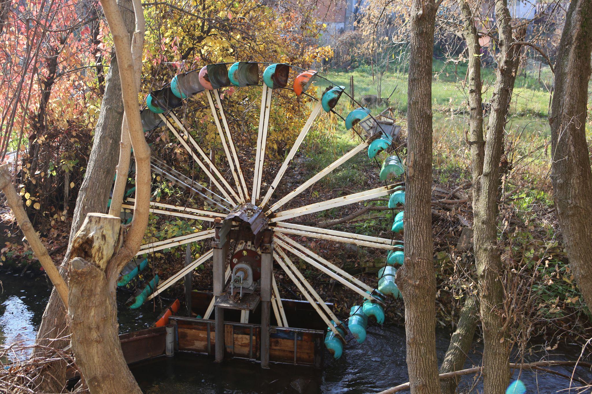 Крізь прохід в гаражах, що за будинком, прямуємо просто до річки. У річищі обертається колесо саморобної гідроелектростанції. Сконструював її місцевий житель Іван Верещак.