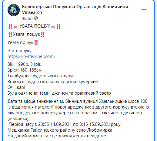 Волонтерська Пошукова Організація Вінниччини Vinsearch повідомляє, що втікачка через вікно стрибнула з другого поверху відділення патології новонароджених.