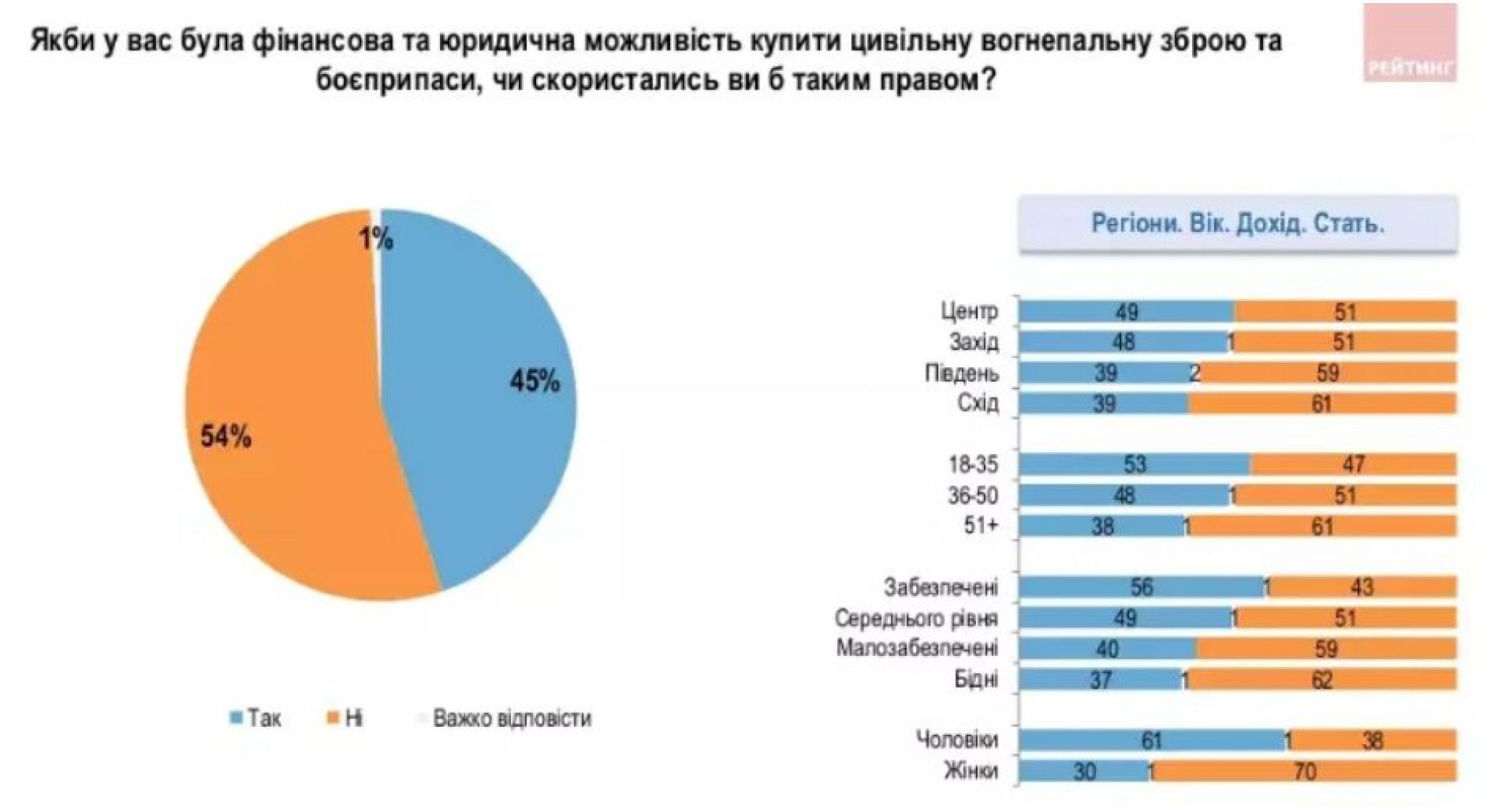 Понад 60% вважають, що масове озброєння громадян України вогнепальною зброєю сприятиме зміцненню обороноздатності країни. Водночас 58% побоюються, що вільна купівля вогнепальної зброї призведе до збільшення злочинності.