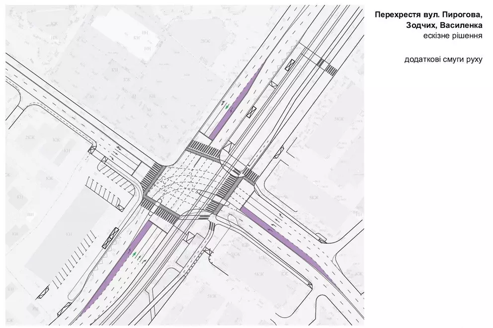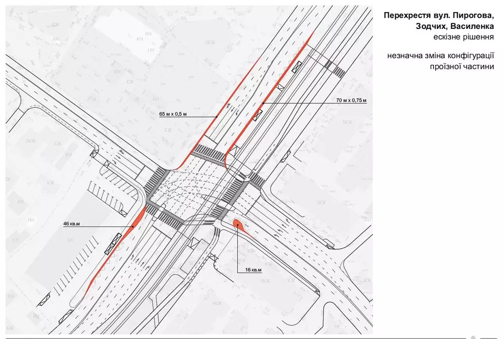 1. Створення додаткових смуг руху — по вулиці Зодчих та по вулиці Пирогова (в обох напрямках). Вони тут з’являються шляхом звуження (нанесення нової розмітки - авт.) наявних смуг до чинних ДБН. Також трохи переставляють бордюри вглиб тротуарів, щоб пішоходи «поділилися» місцем з автомобілістами.