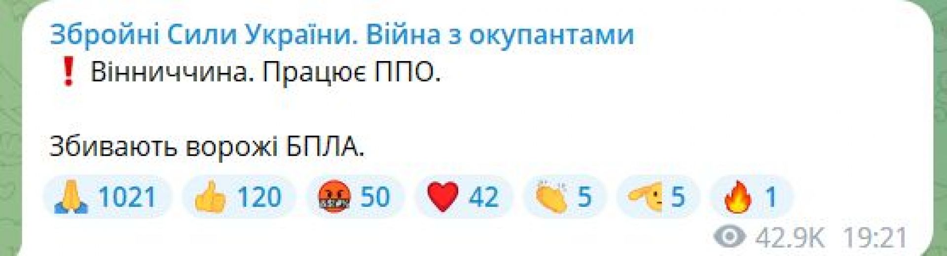 — Вінниччина. Працює ППО. Збивають ворожі БПЛА, — йдеться у повідомленні Telegram-каналу Збройні сили України.