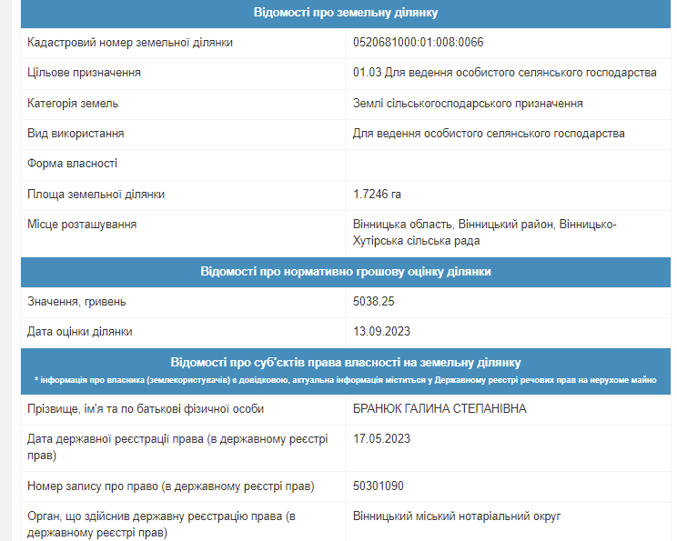 У власності Галини Бранюк, крім вищевказаної землі, ще є шість земельних ділянок — чотири у Вінниці, дві в Яремче, Івано-Франківська область. І ще два об’єкти нерухомості: на вулиці Джеймса Мейса (колишня Кузнецова), 1 та на вулиці Бучми, 143 у Вінниці. Зв’язків з іншими підприємствами у ФОП Галини Бранюк немає, показує аналіз YouControl.