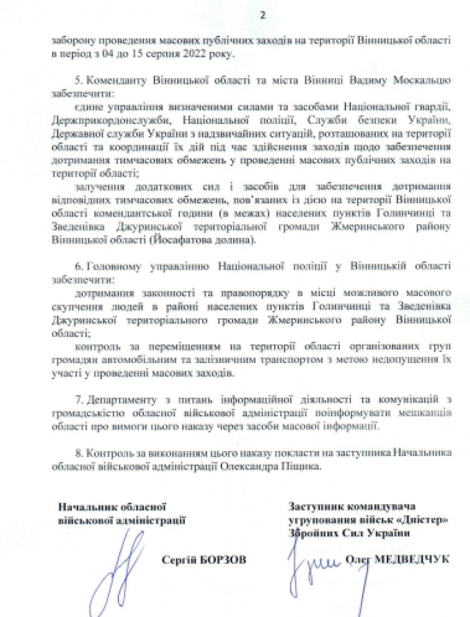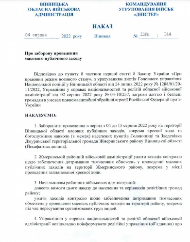 — Відповідно до наказу Начальника ОВА Сергія Борзова від 4 серпня 2022 року №1386/144, протягом 4 – 15 серпня 2022 року на території Вінницької області ЗАБОРОНЕНО проведення масових публічних заходів, зокрема, хресної ходи та богослужіння навколо (в межах) населених пунктів Голинчинці та Зведенівка Джуринської територіальної громади Жмеринського району Вінницької області (Йосафатова долина), — кажуть у Вінницькій ОВА.