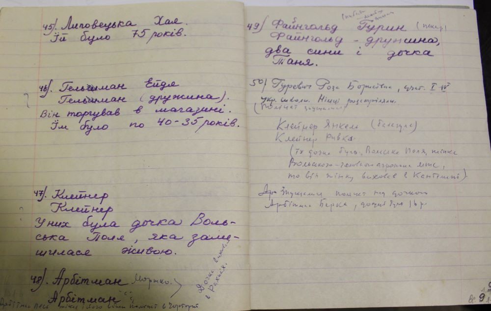 Таким чином у синьому зошиті, розпочатому з ініціативи її батька, тепер 200 прізвищ розстріляних євреїв. Жінка порівнює їх кількість з іншою цифрою: з фронтів Другої світової не повернулися 89 жителів Китайгорода.