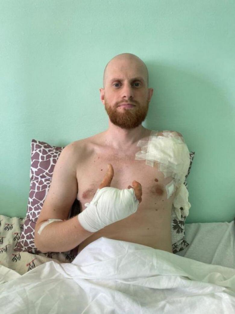 — Мені прилітає куля в шолом справа, — розповів Дмитро Фінашин. — Я почув сильний удар. Вона передала багато енергії безпосередньо шолому, кинула голову мою в сторону. І такий гучний звук. Я думав, що щось вибухнуло насправді. Оглушило дуже сильно, а це була куля. Вона пройшла в шолом, подряпала лоб легенько. Шкіру чисто зачепило дуже легко. Мені дуже пощастило в той момент. Відповзаю з того місця, де мені влучили, і мені прилітає в ліву руку, перебиває кістку, артерію. Куля зайшла в корпус, пройшла під ключицею і вийшла на грудях. Кажу хлопцям – мотайте мене. Я відчуваю, що просто сили виходять щосекунди. Сильна кровотеча, і я просто стікаю. Кажу — мотай, накладай турнікет, бо я зараз відійду, стечу кров’ю.