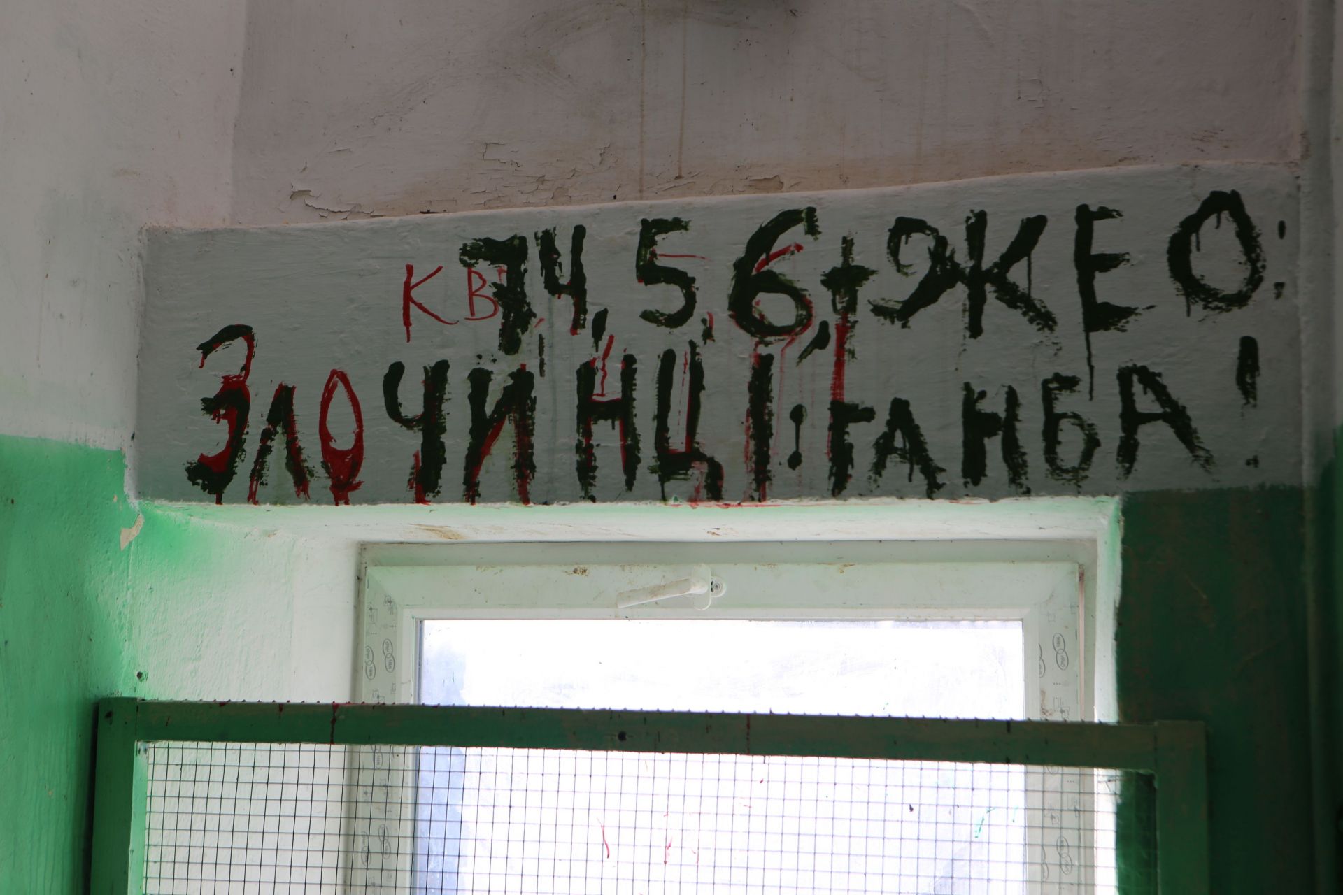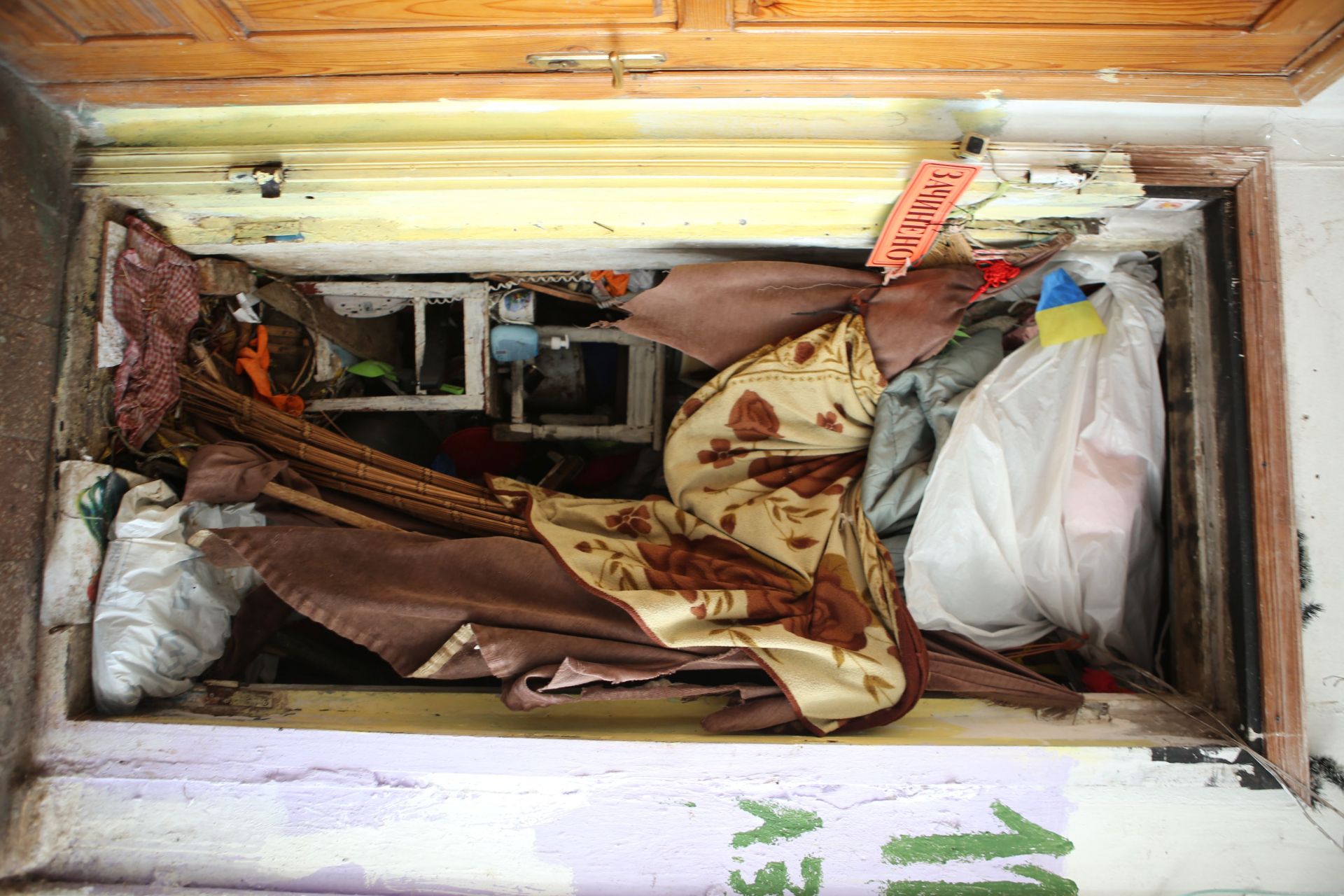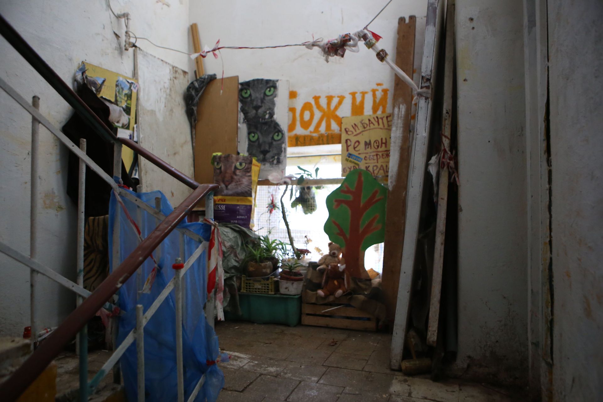 На сходовій клітині — «арт-інсталяція» з непотребу. На стінах написано, що «ЖЕО» та номери квартир — «злочинці» й «ганьба». На деяких вхідних дверях написано коричневою «фарбою» — «борг».