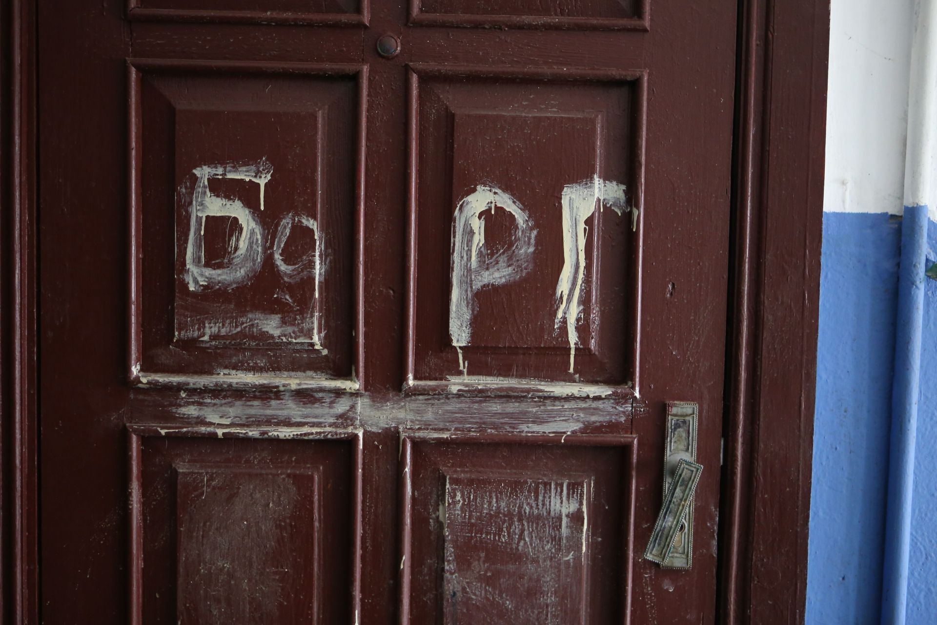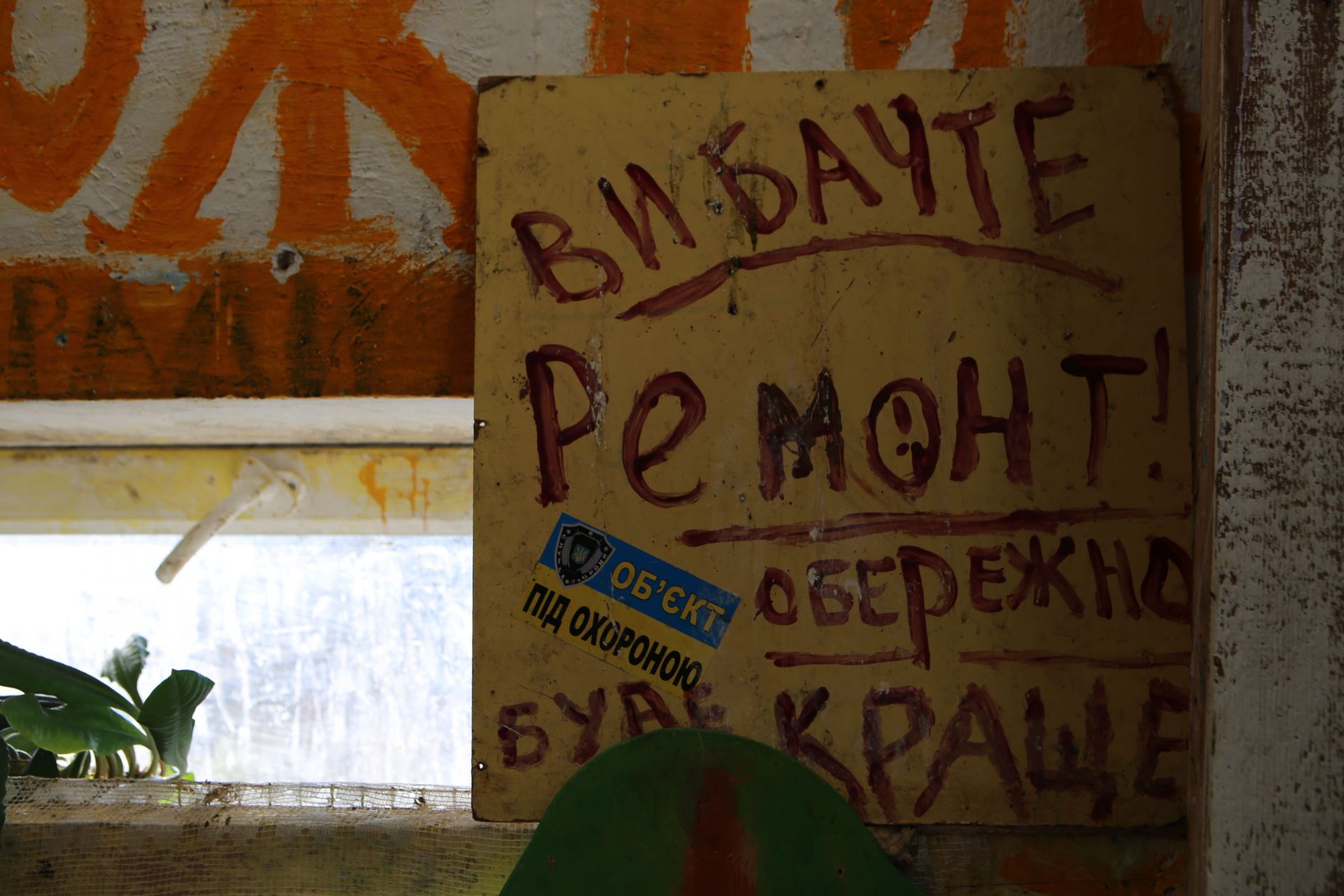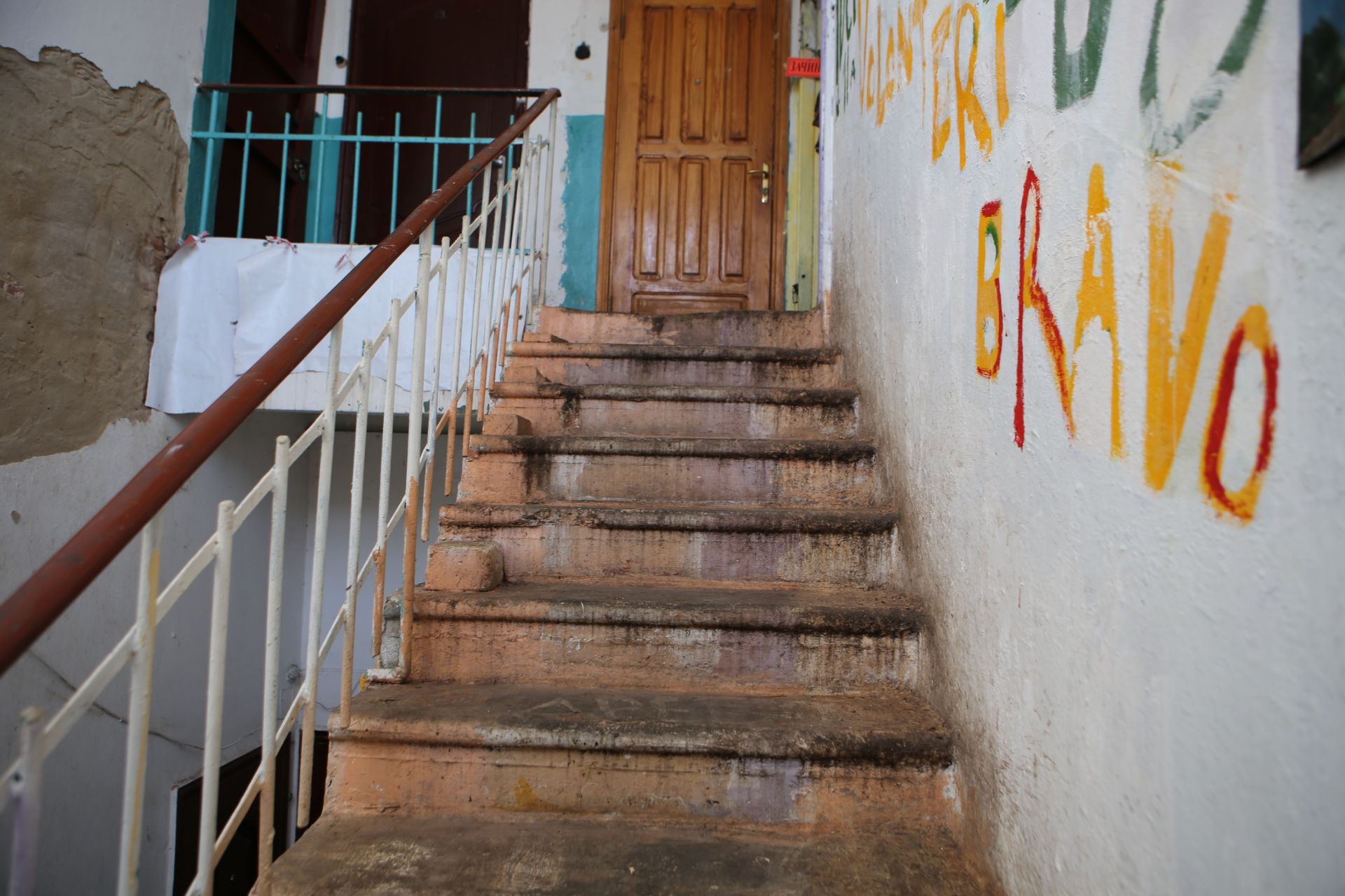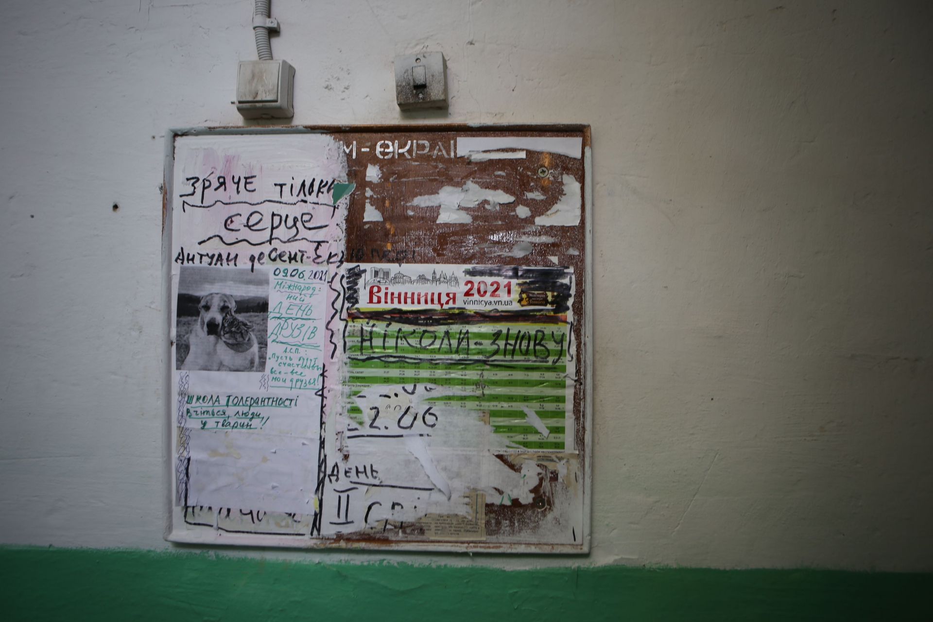 На сходовій клітині — «арт-інсталяція» з непотребу. На стінах написано, що «ЖЕО» та номери квартир — «злочинці» й «ганьба». На деяких вхідних дверях написано коричневою «фарбою» — «борг».