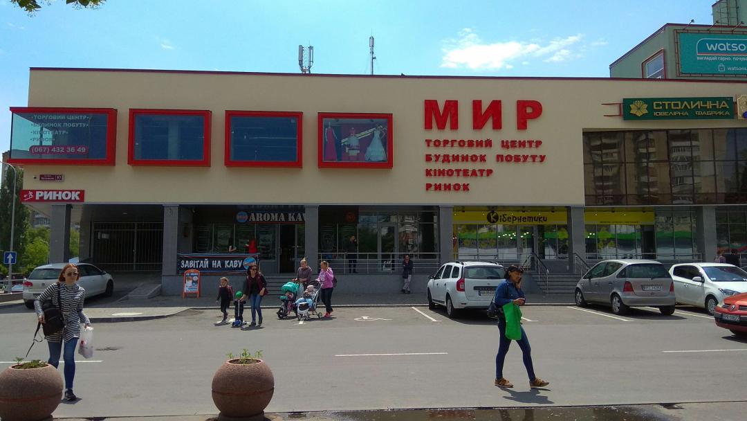 Будівля сучасного ТРЦ «Мир» виросла на місці кінотеатру «Мир», відкритого у 1982 році. Його збудували замість старішого кінотеатру «Вишенька». З часом заклад занепав, але у 2000-х його почали відроджувати. У 2014 році розпочалася масштабна реконструкція: будівлю значно розширили і перетворили на торговельно-розважальний центр. Після оновлення тут знову запрацював кінотеатр — тепер під брендом Filmax.